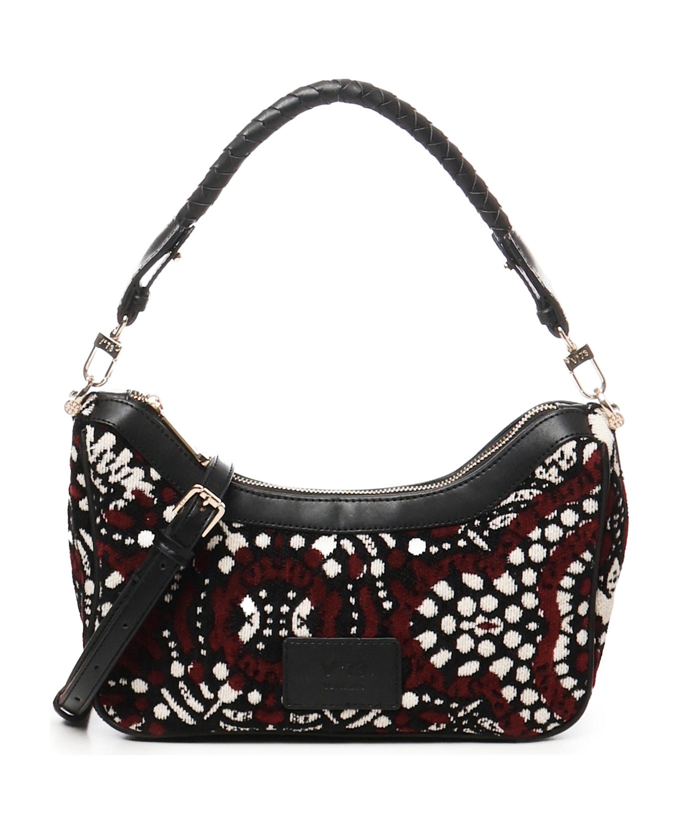 -Patterned fabric shoulder strap -Braided handles and micro grain inserts -Embossed logo patch -Zip closure -Adjustable and removable shoulder strap -Measurements: 28 x 21. 5 x 12 cm -Color: Bordeaux