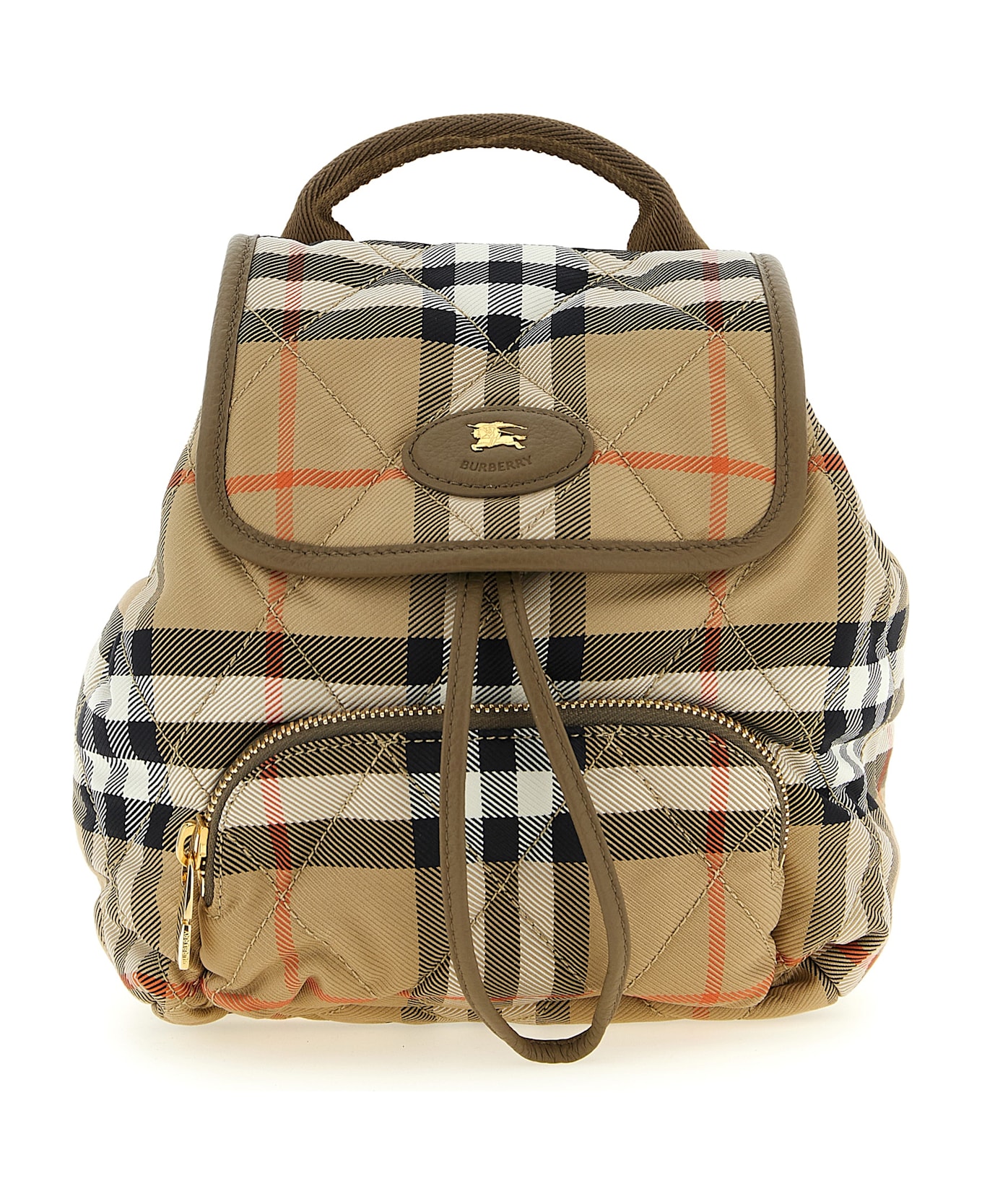 'Horseshoe' mini? quilted nylon backpack woven with Burberry Check and solid hammered leather, fixed tape handle, magnetic flap closure with leather patch and front 'Equestrian Knight Design' logo, inner drawstring, front zip pocket, adjustable ribbon shoulder straps, nylon lining.