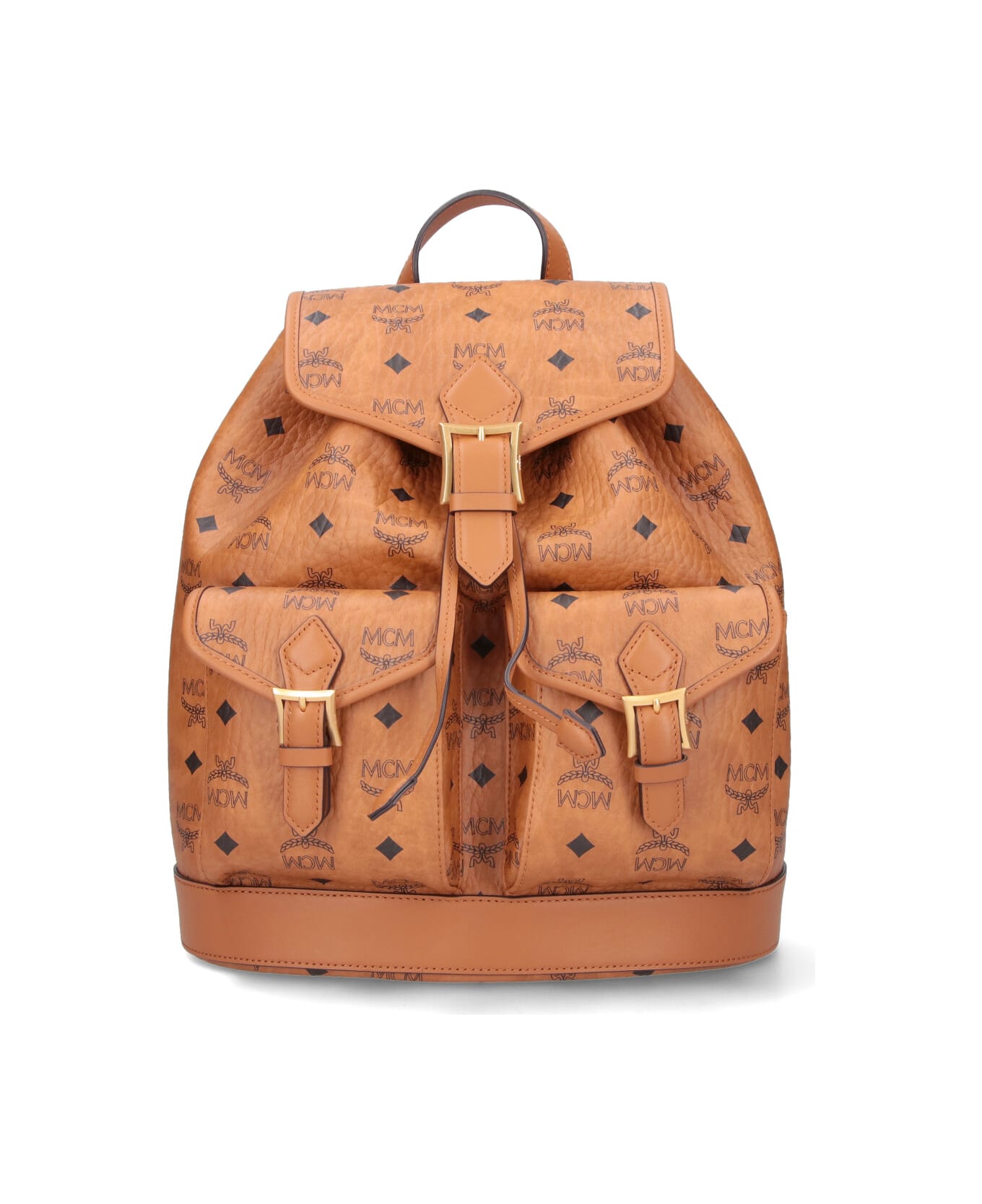 Small backpack MCM Aren in brown "Visetos" with leather trim, logo print pattern, handle, removable gold metal chain shoulder strap, two adjustable back shoulder straps, strap and drawstring flap closure, two front strap flap pockets, one inner flat pocket, one single inner compartment.