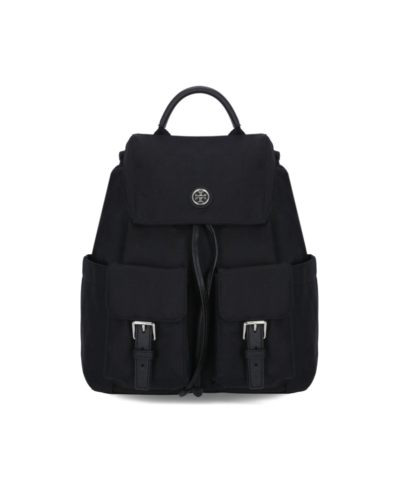 - Black Tory Burch fabric backpack for woman - Handles - Adjustable shoulder straps - Interior pocket - Flap and drawstrings fastening - Front metallic logo - Two front flap pockets with buckle - Two side pockets