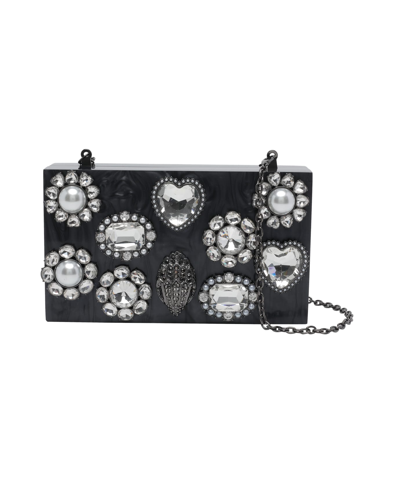 Kurt Geiger black Crystals box clutch, magnetic closure, removable chain strap, crystals allover