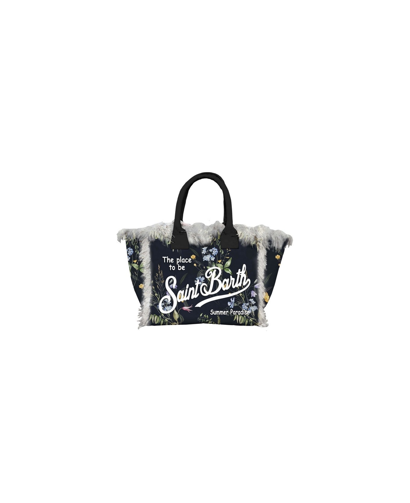 Wonder flowers Colette canvas bag by MC2 St. Barth, cotton canvas material, exclusive Saint Barth printed logo, zip closure, cotton canvas fringes, internal zip pocket with detachable shoulder strap