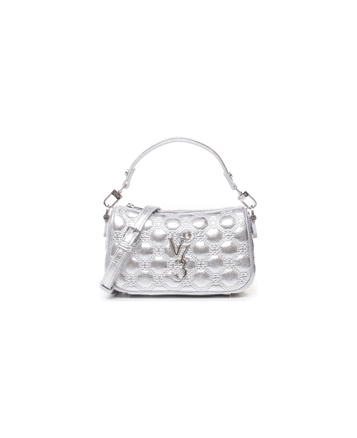 -Metallic quilted bag -Top handle -Adjustable shoulder strap -Maxi vertical logo -Measurements: 21 x 11. 5 x 7 cm -Color: Silver