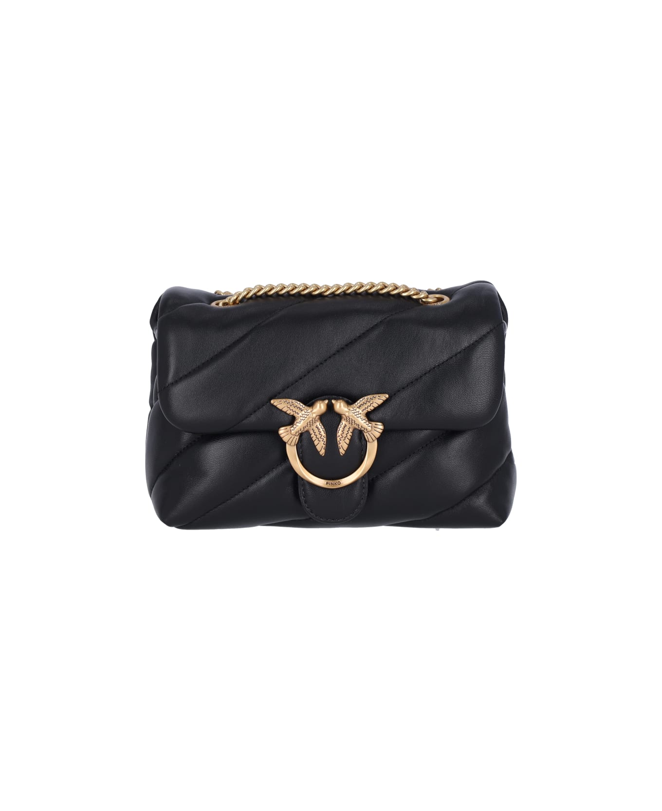 Pinko mini Love Puff bag in black nappa leather with gold metal details, all-over oblique maxi quilted pattern, sliding chain shoulder strap, embossed Love Birds Diamond Cut logo on the front, tone-on-tone logo stitching on the back, interlocking button flap closure, main inner compartment, inner zip pocket, inner flat pocket.