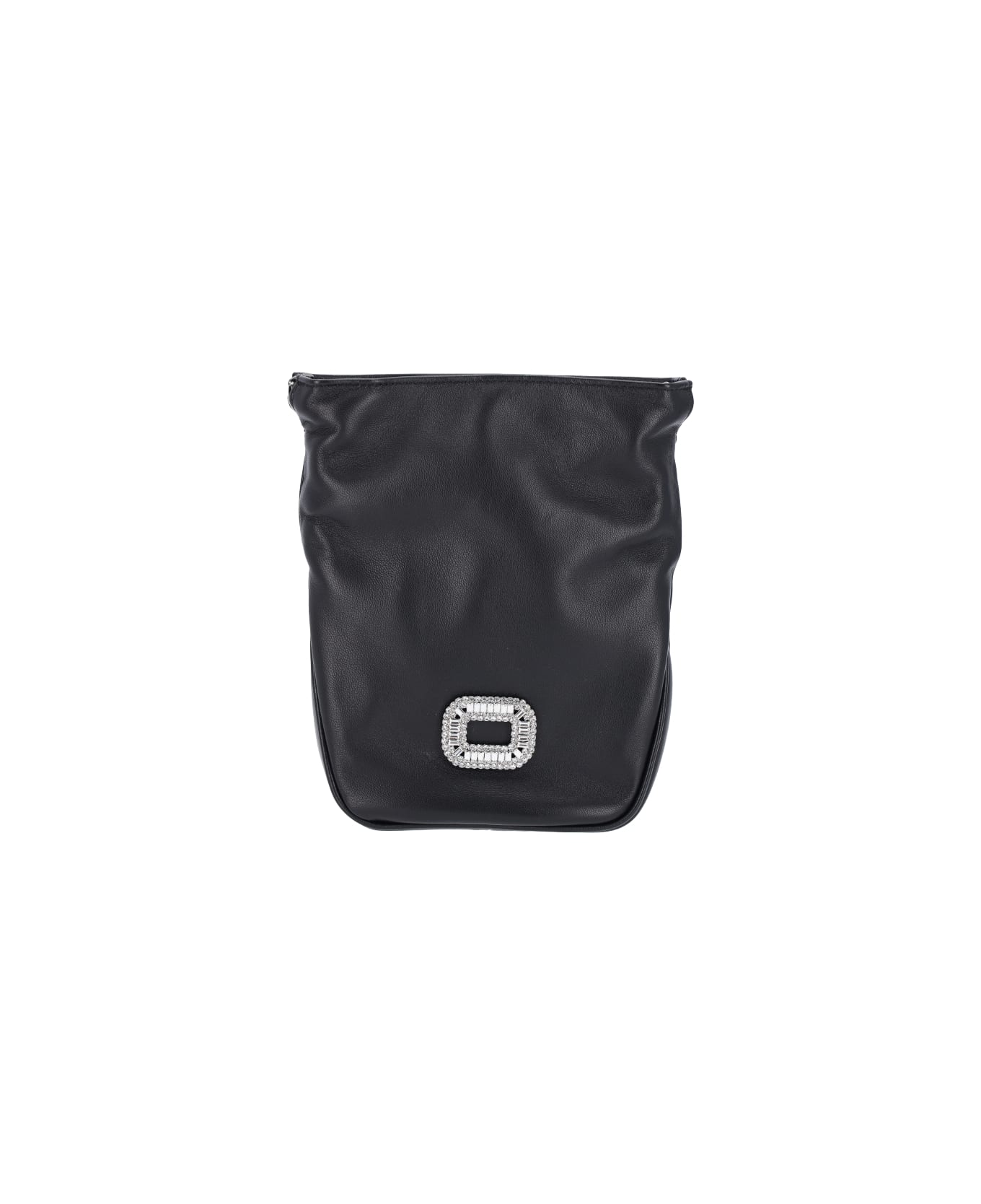 Roger Vivier 'pilgrim pocket' mini bag in black lamb leather, silver metal chain shoulder strap, rectangular design, baguette crystals on the front, inner flat pocket, single main inner compartment.