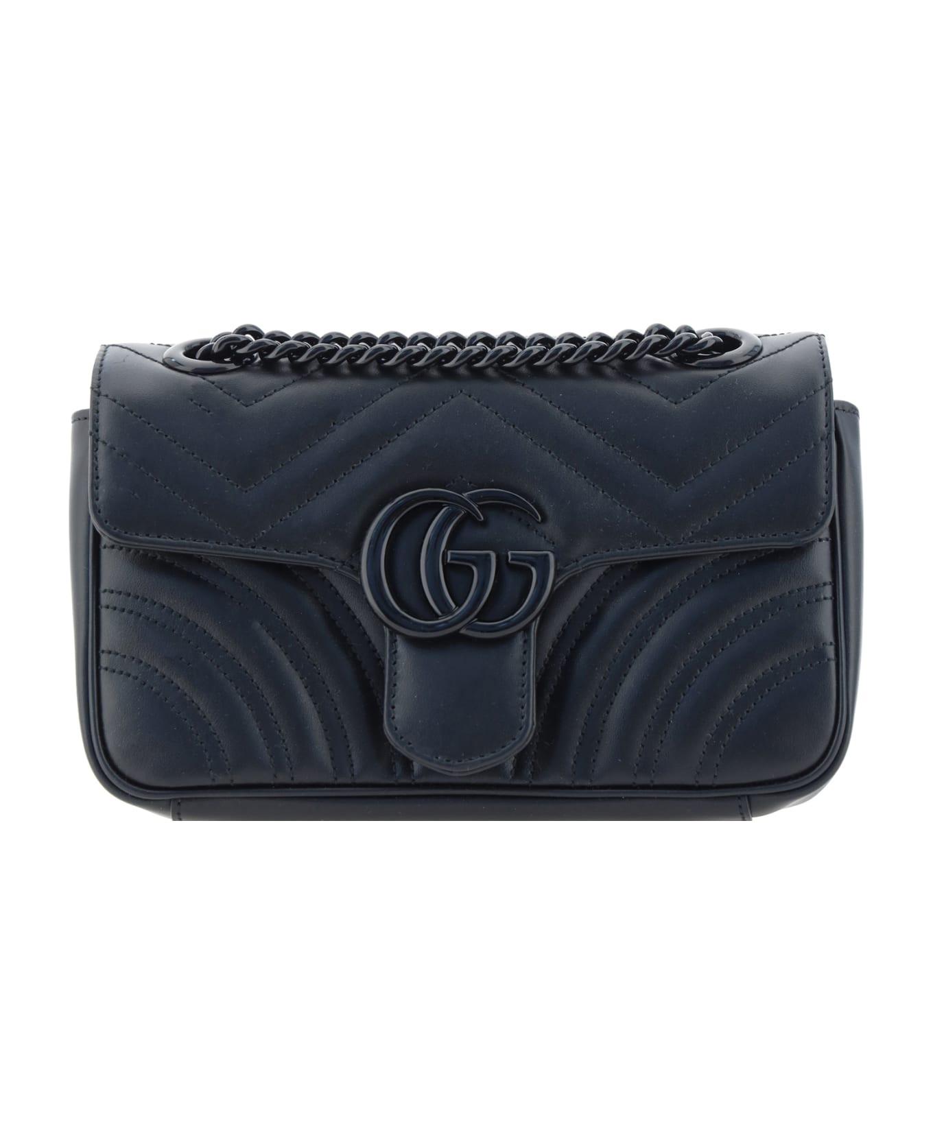 Calfskin mini marmont shoulder bag by gucci, quilted leather matelassé design, sliding chain shoulder strap, front flap with snap closure, iconic three-dimensional embossed tone-on-tone brand logo on front, all-over quilted design, interior zippered welt pocket, flat card pocket.