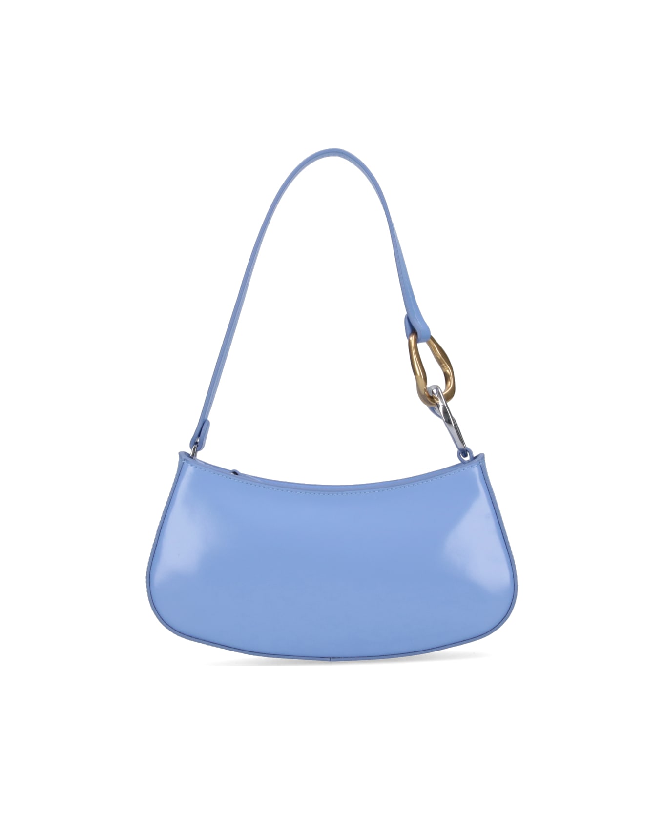 Staud mini 'Ollie' shoulder bag in blue brushed leather with gold and silver metal details, shoulder strap with attached hardware, zip closure, main inner compartment.