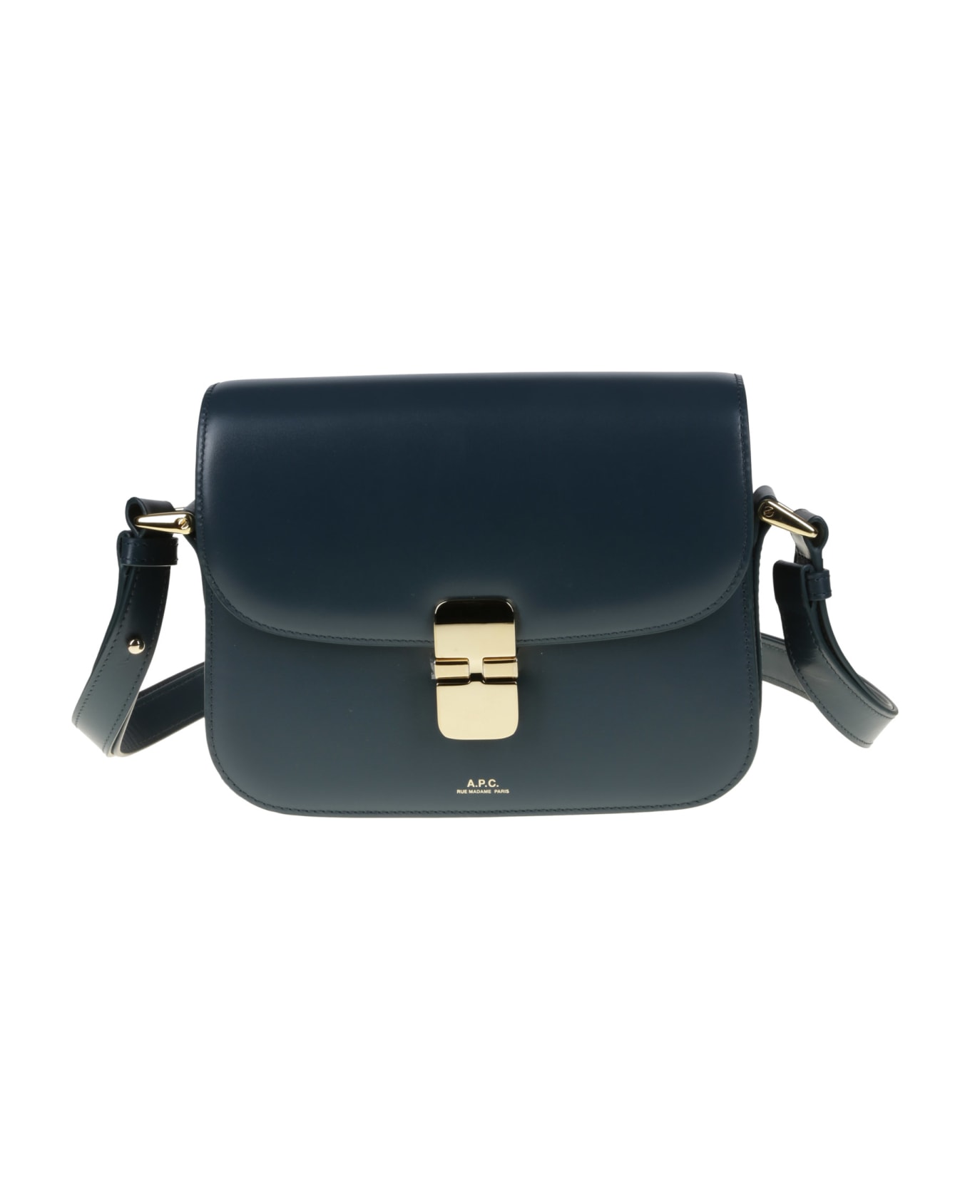 A. P. C. Petrol green leather bag, buckle closure, adjustable shoulder strap, logo detail.