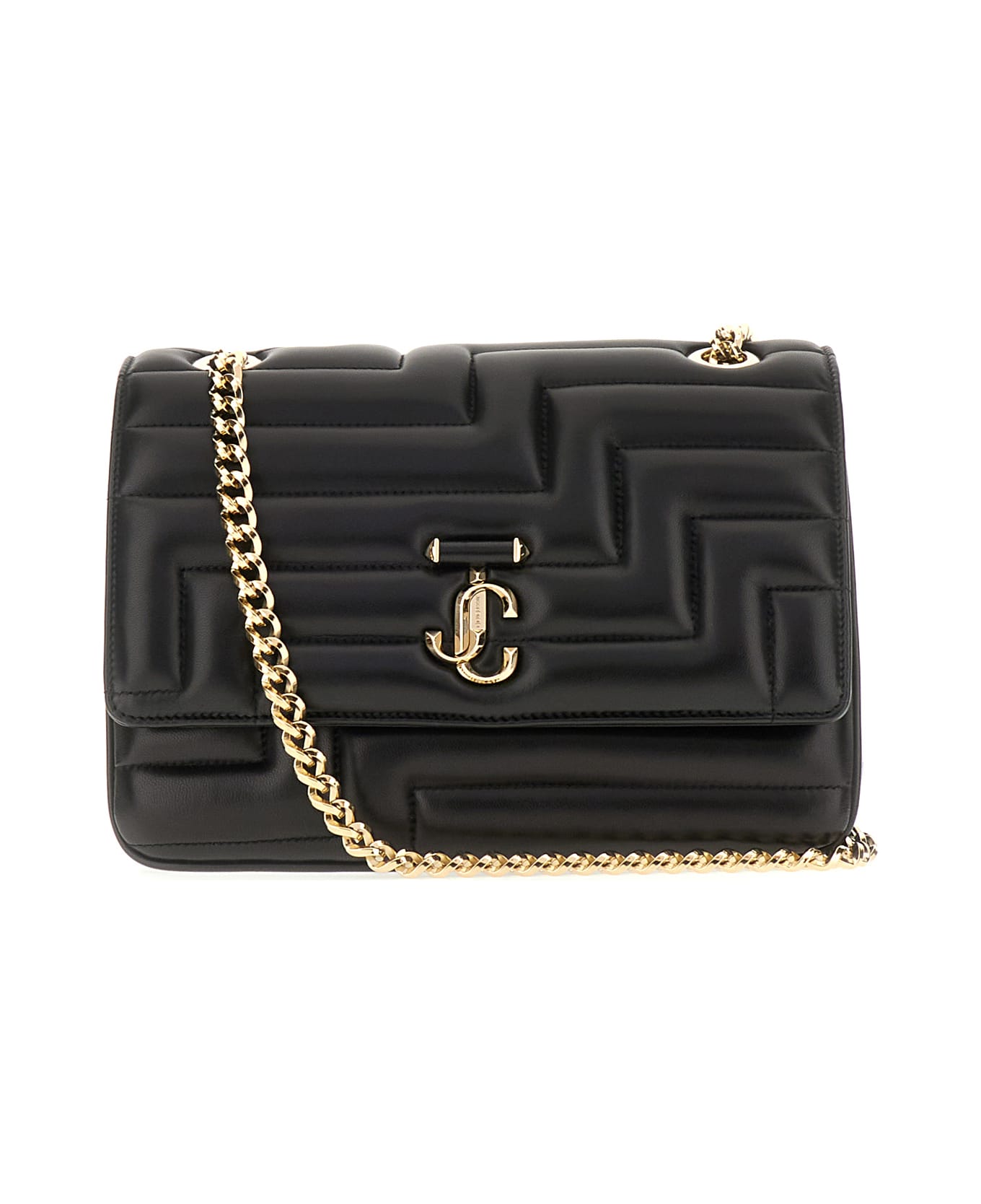 Shoulder bag realized in nappa leather enriched by metal logo detail at the front. -Metal chain shoulder strap with ronal leather shoulder pad that can be worn single or double -Snap button closure under the flap -Lined interior with two compartments and a zip pocket