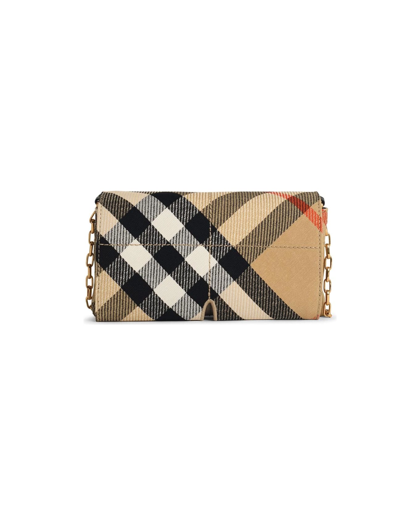 Chain shoulder strap, contrast 'Check' pattern, geometric stitching, magnetic closure, single inner compartment, six card slots, slit pocket in the back, hand-painted edging\n21x13x6cm Composition: 65% polyester, 35% cotton
