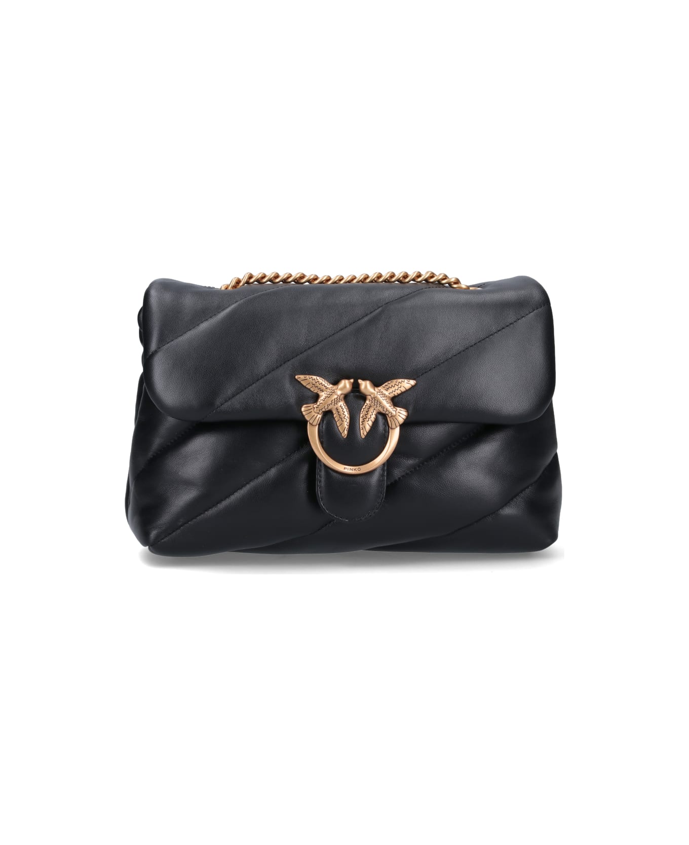 Pinko 'Classic Love Puff' logo crossbody bag in black hammered nappa leather with gold zinc details, quilted and padded design, sliding chain shoulder strap, tone-on-tone logo stitching on the back, flap closure with snap button, Love Birds Diamond Cut logo buckle detail, two separate inner compartments, a zip pocket with inner zipper.