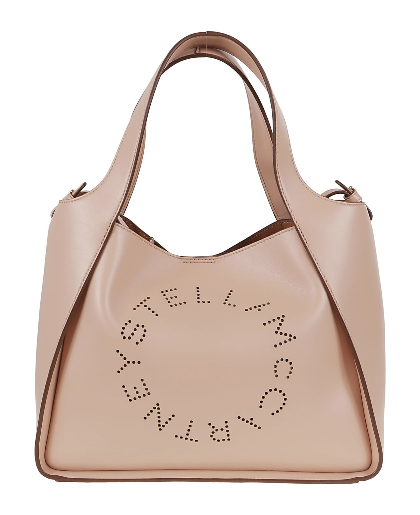 Faux leather small Stella Logo tote bag from STELLA MCCARTNEY featuring perforated logo detail, two top handles, magnetic fastening, removable pouch and detachable shoulder strap. At least 50% of the main material of this product meets our conscious criteria: for example, it`s either organic, recycled, upcycled, or independently recognised as being better for the environment (such as linen, ramie, Tencel, etc. ).