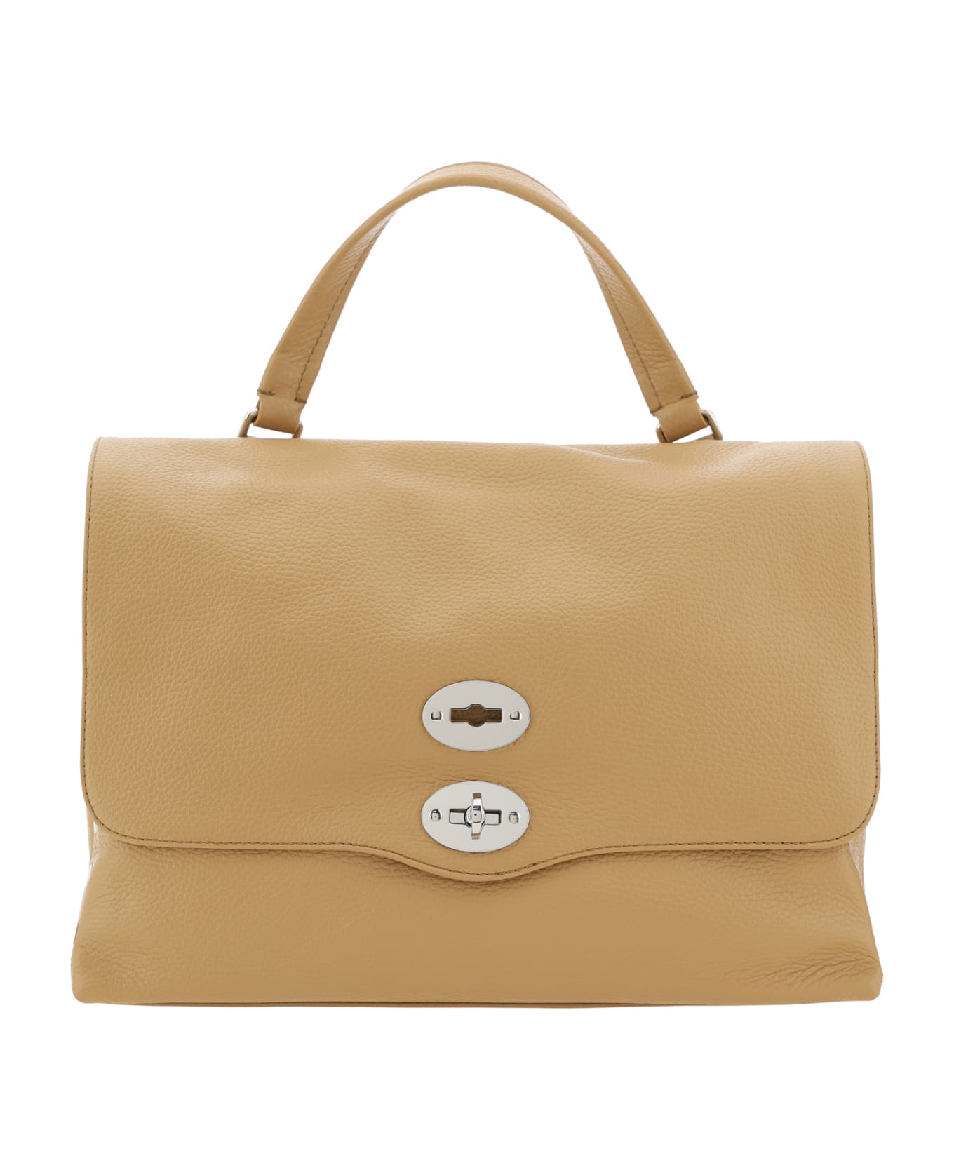 Calfskin daily postina bag by zanellato, single flat leather handle on top, front closure with swivel hook, adjustable and removable shoulder strap, flat studs on side panels, two interior compartments with welt pocket.
