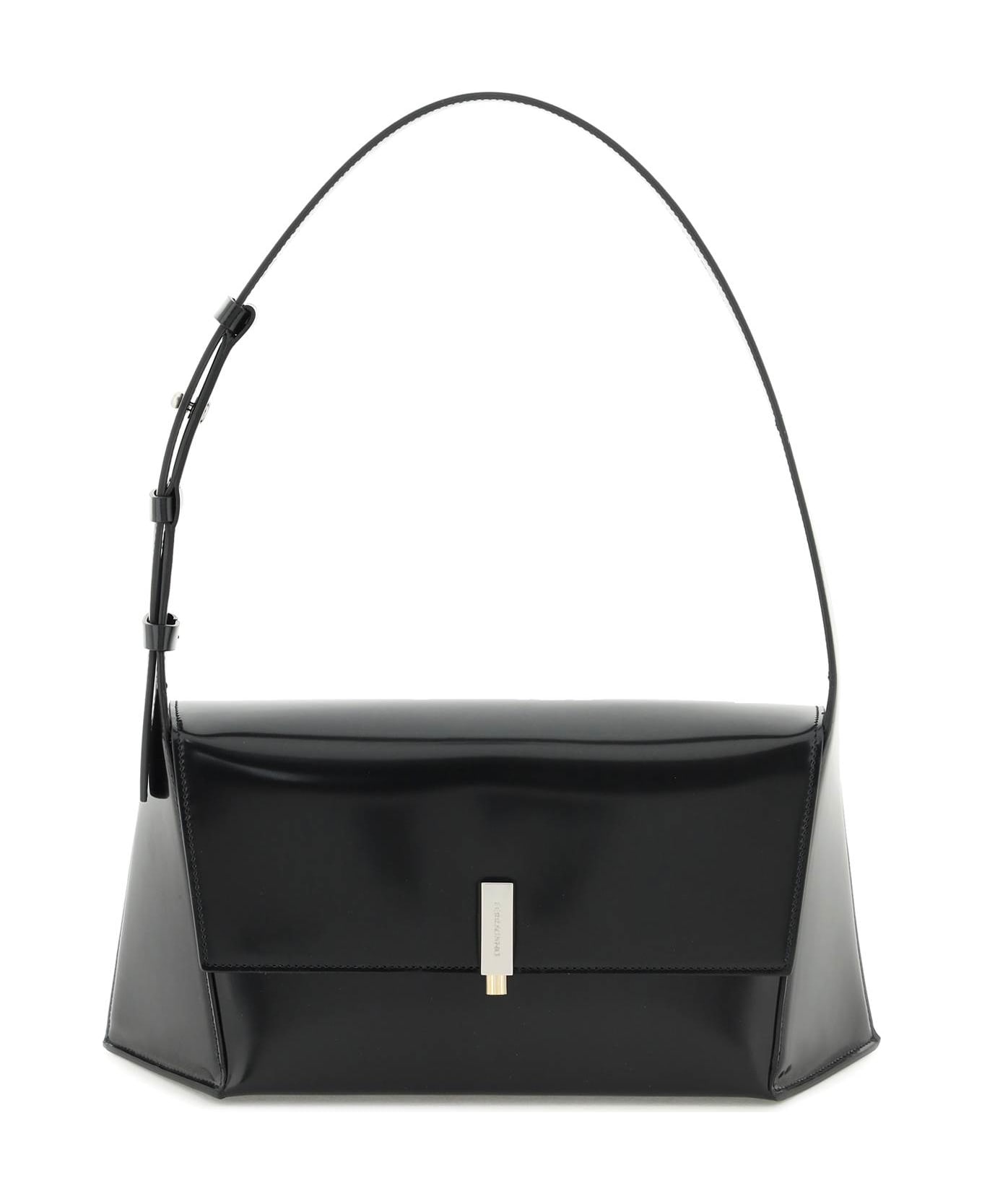 FERRAGAMO shoulder bag crafted in glossy leather with a geometric structure. Adjustable stiff handle, metal fastening with Gancini profile, smooth leather interior with two open pockets and satin steel-finished metalware.