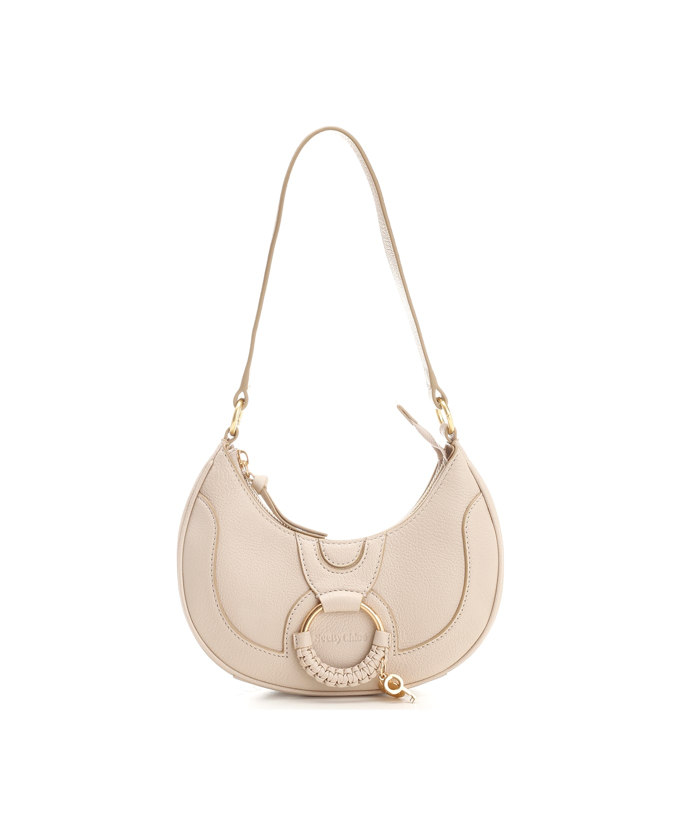 Beige "Hana" half-moon bag from See By Chloé in grained goatskin and suede cowhide, oversized ring with woven pattern, top zip closure, non-removable and non-adjustable short shoulder strap.