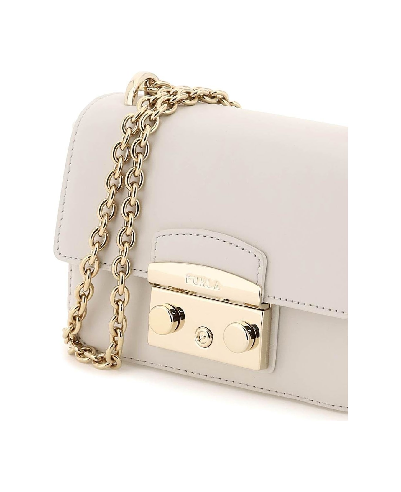 Furla Metropolis Mini bag in leather with a structured line with flap and snap closure. Adjustable chain shoulder strap, fabric-lined interior with a flat pocket and gold-tone metalware.