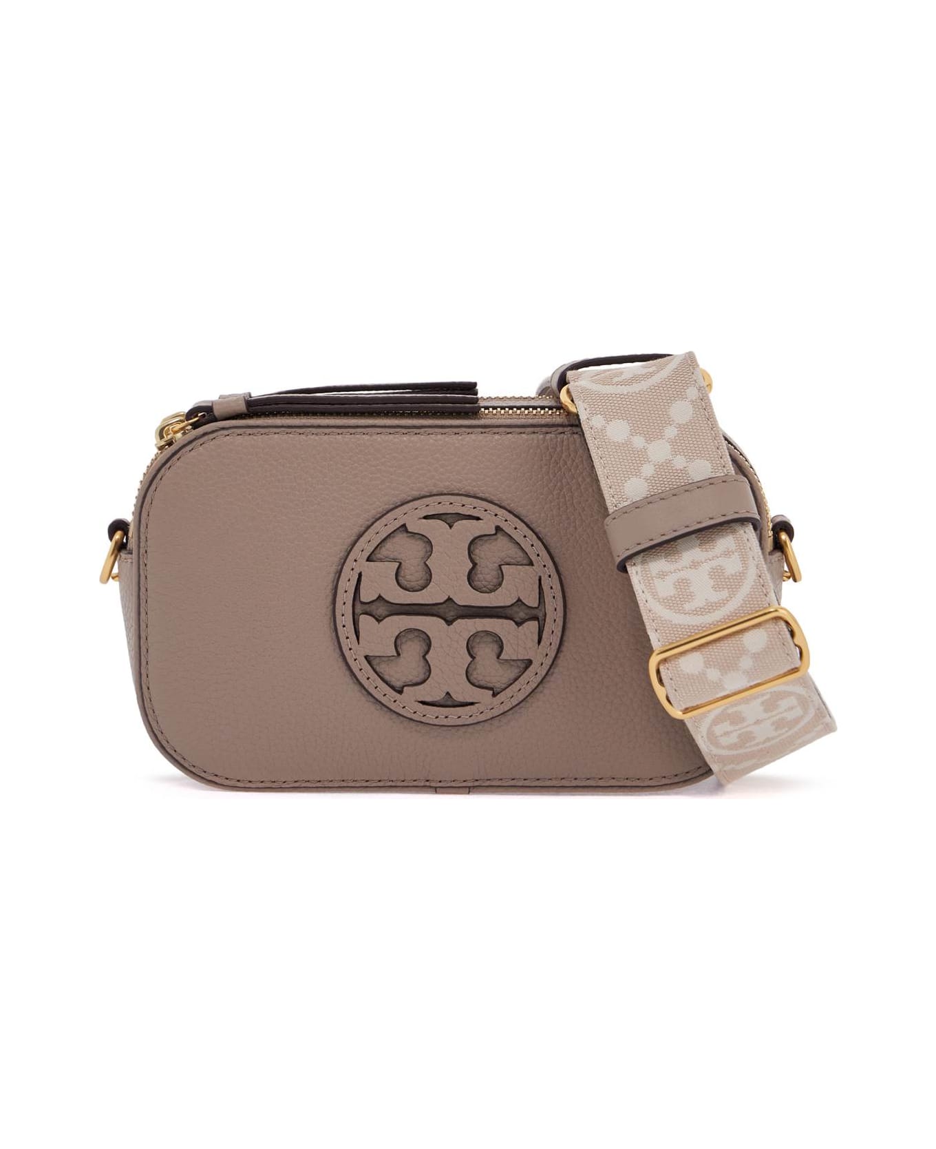 Miller crossbody bag by Tory Burch made of grained leather and characterized by tonal double-T monogram embossed at front. It features suede lining, two zippered compartments one of which displays an open pocket, adjustable and removable shoulder strap with jacquard monogram pattern and leather trims. Gold-finished metalware.