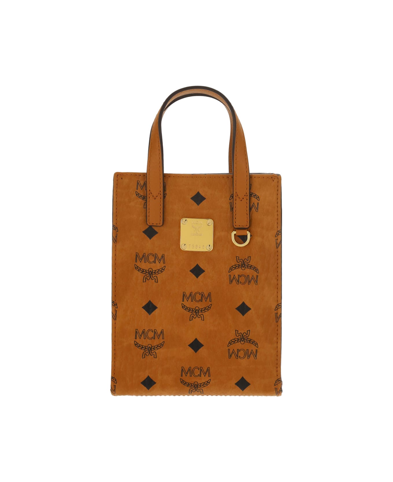 Mini tote bag by mcm, double rigid handle, design with all-over repeated iconic brand monogram pattern, brand monogram engraved on front embossed applique plaque, adjustable and removable shoulder strap, single interior compartment, interior patch pocket.
