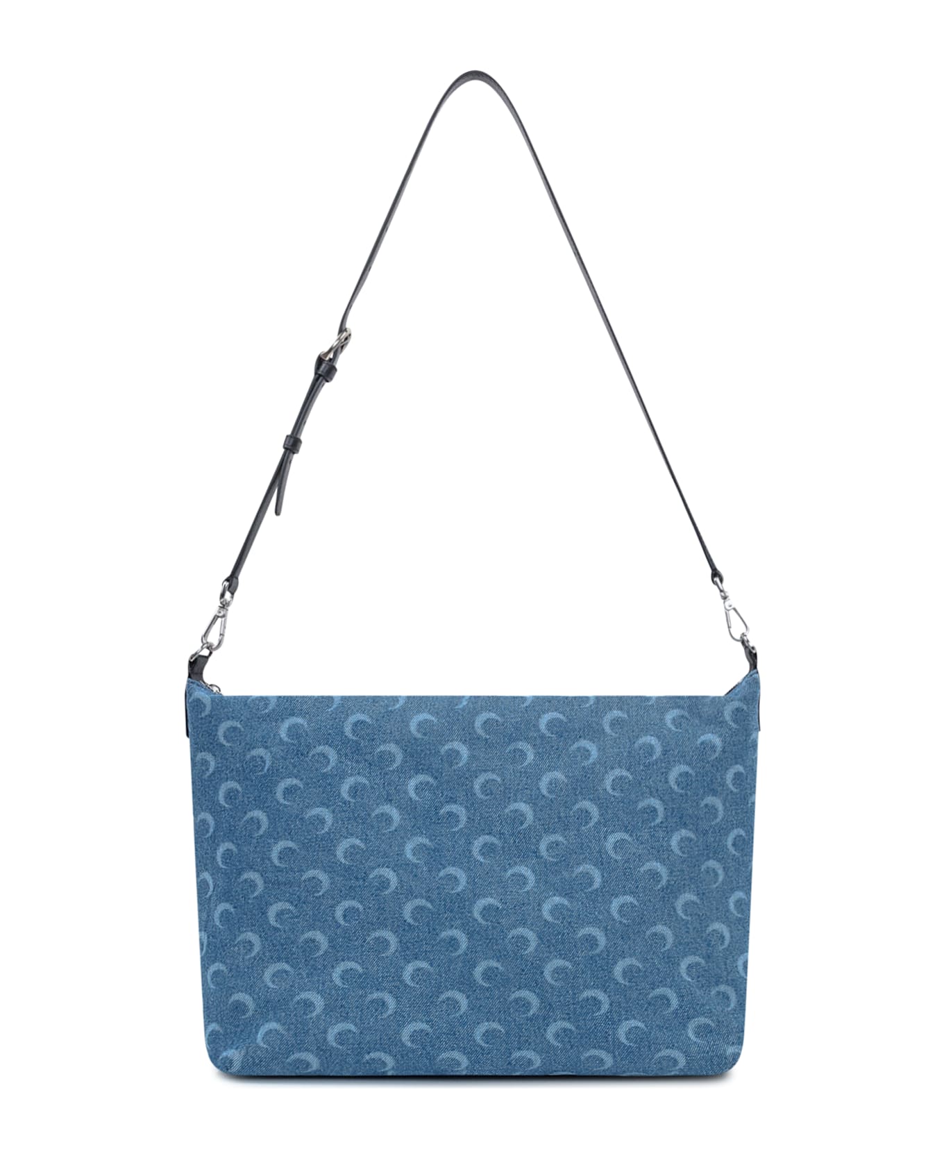 Denim shoulder bag. Adjustable and removable leather shoulder strap. One internal compartment with pocket. Print with all-over Moon logo.