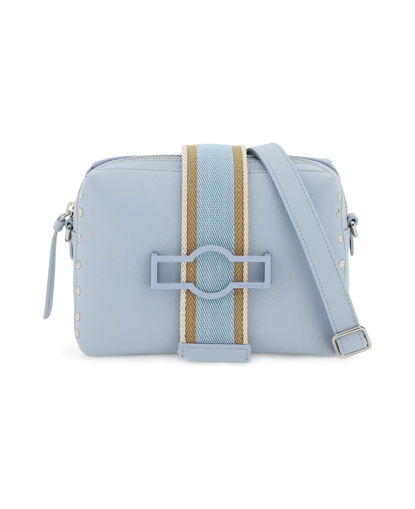 Oda camera bag by Zanellato, made of soft grained leather and featuring multicolored ribbon and the signature ZO monogram. Zippered closure, fabric interior with one open flat pocket and adjustable, detachable leather shoulder strap. Silver-finished metalware.
