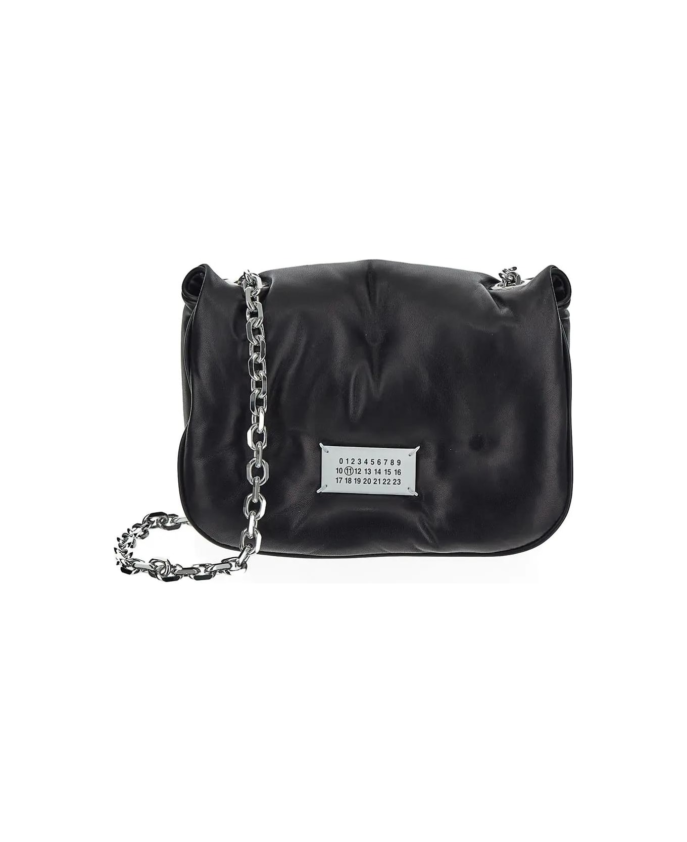 Maison Margiela shoulder bag in black puffer faux leather with stitched branded tag on the front, adjustable chain shoulder strap with black faux leather detail, flap with magnetic closure, a main compartment, an open pocket and silver-toned metal hardware.