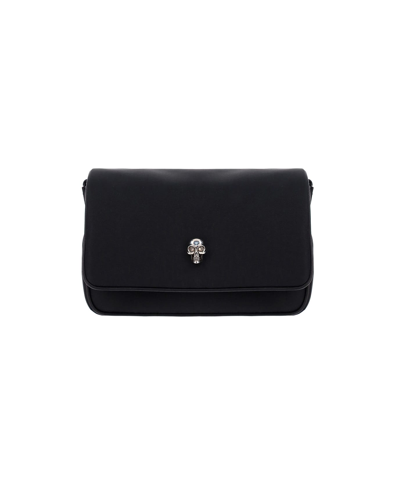 Nylon Small Skull Shoulder Bag by Alexander McQueen, featuring a chain shoulder strap with leather details, a flap with magnetic closure, a skull front plaque, a printed logo at the rear, an internal compartment with a leather card pocket.