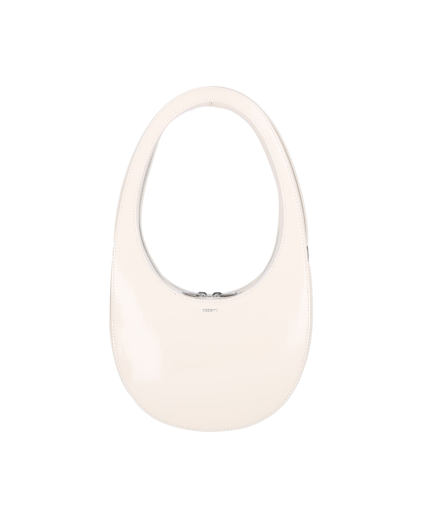 Coperni 'Swipe' shoulder bag in white leather with oval design, rigid top handle, removable shoulder strap, silver logo print on the front, white side logo label, double zip closure, single inner compartment.