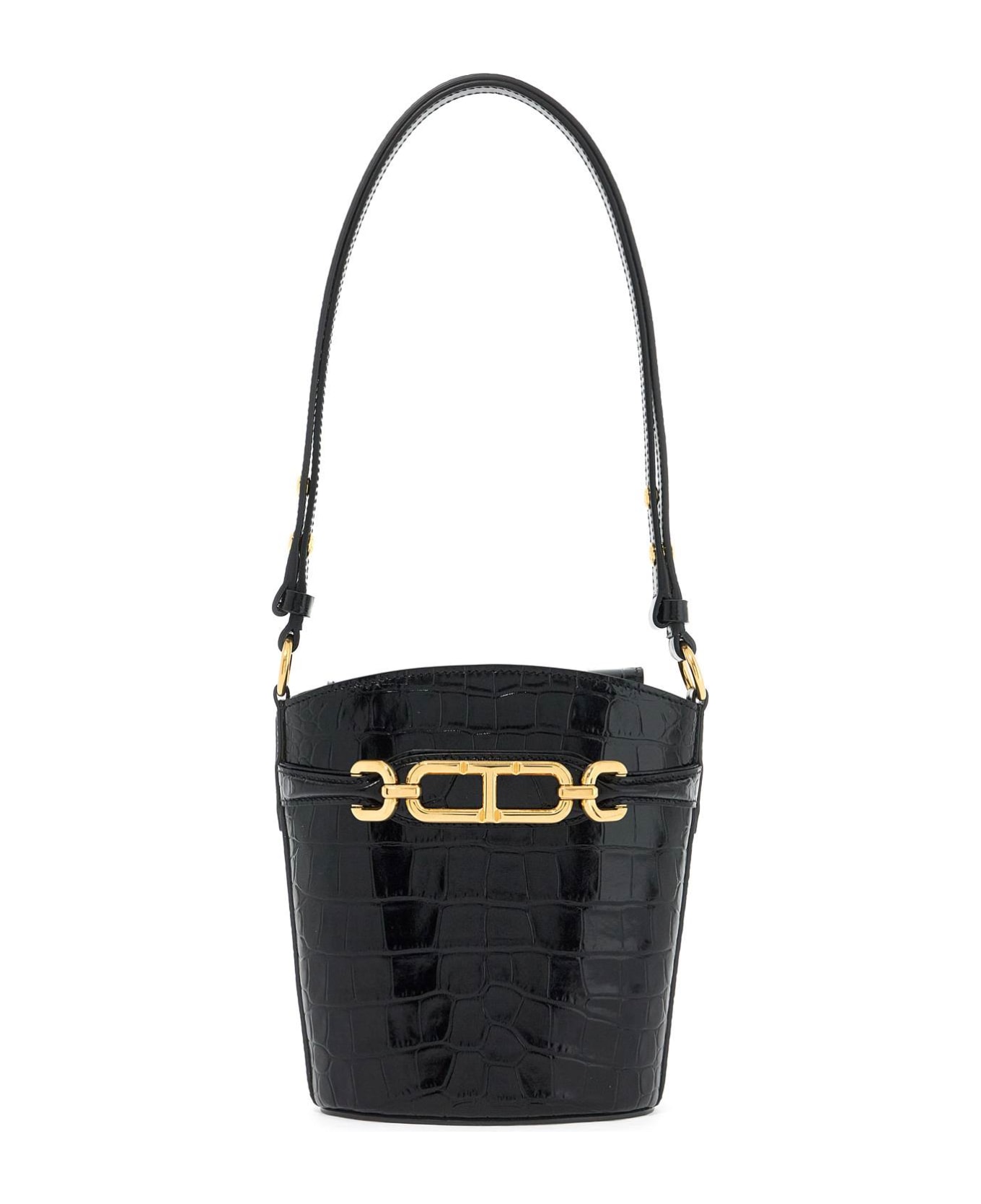 This mini bucket bag by Tom Ford is made of embossed glossy crocodile leather and adorned with a gold-tone Whitney T metal element on the front. It features a magnetic flap closure, fabric interior, and an adjustable handle. The metallic accessories have a gold finish.
