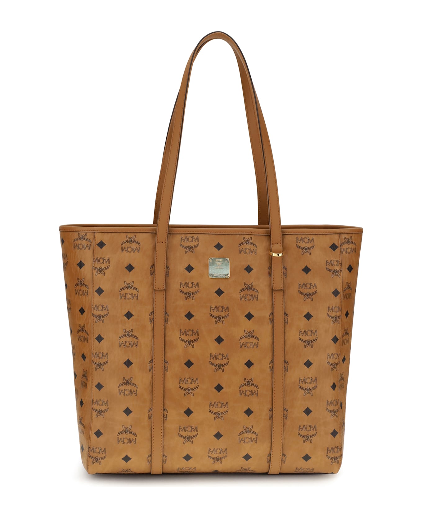 Mcm's toni tote bag is made of canvas covered with the classic visetos print that covers the entire surface, enhanced by a logoed metal tag on the front. equipped with two flat tassel handles for comfortable carrying, it features a zippered closure for added security. on the back is a slit pocket, while the interior is lined and organized with a zippered pocket and two patch pockets, perfect for maintaining order and practicality.