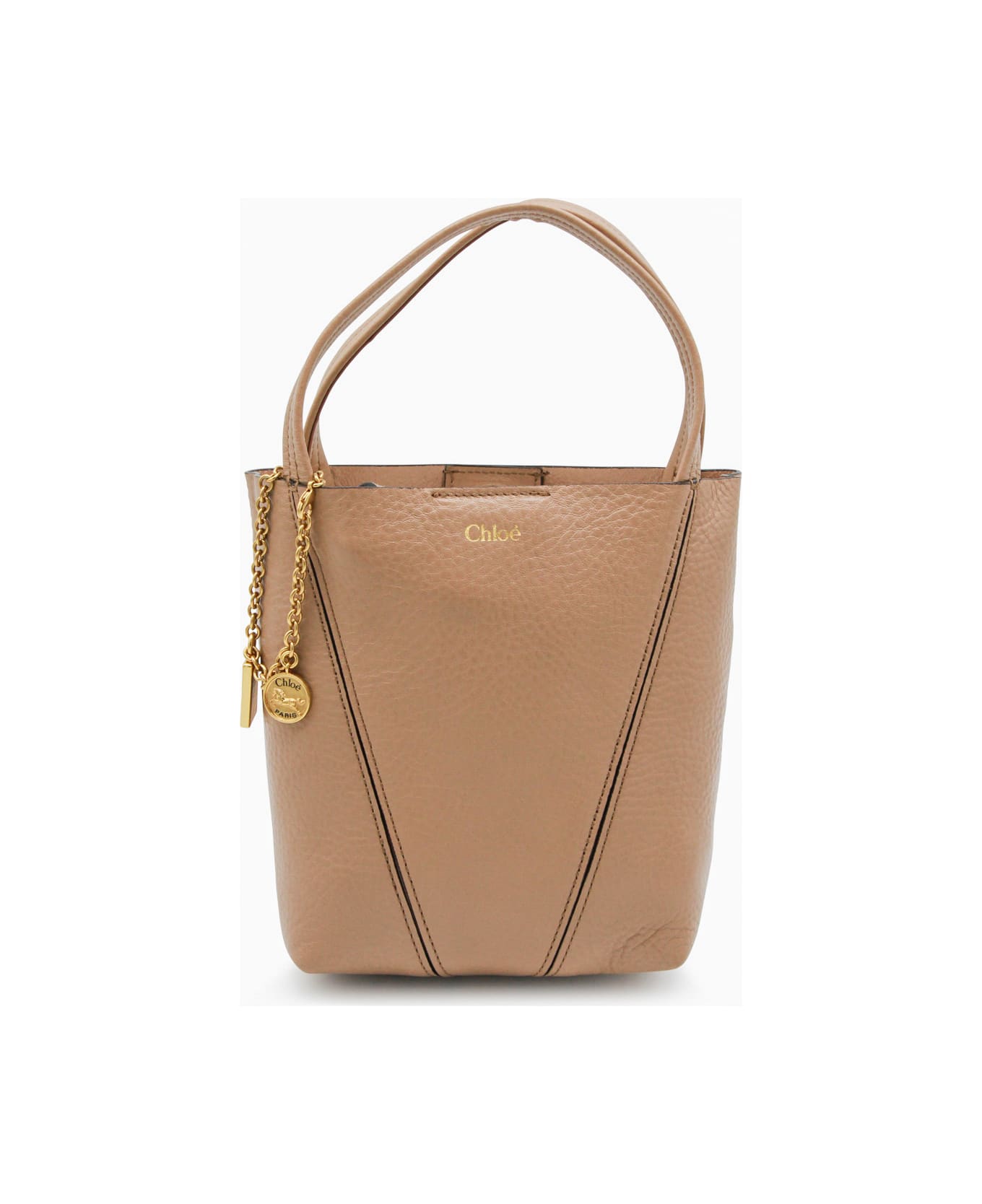 beige leather Spin tote from Chloé featuring top handles, frontal logo print, gold tone pendant, magnetic closure and main compartment. Composition: 100% Le