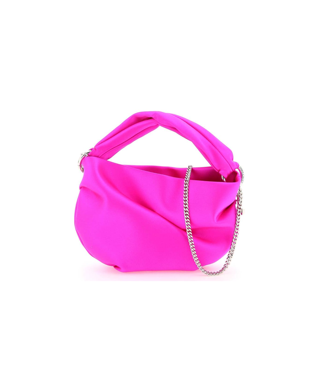 Bonny mini bag by Jimmi Choo made of satin and featuring a woven handle with attached metal JC charm. Chain shoulder strap, fabric interior with one credit card slot and lace-up closure. Silver-finished metalware.