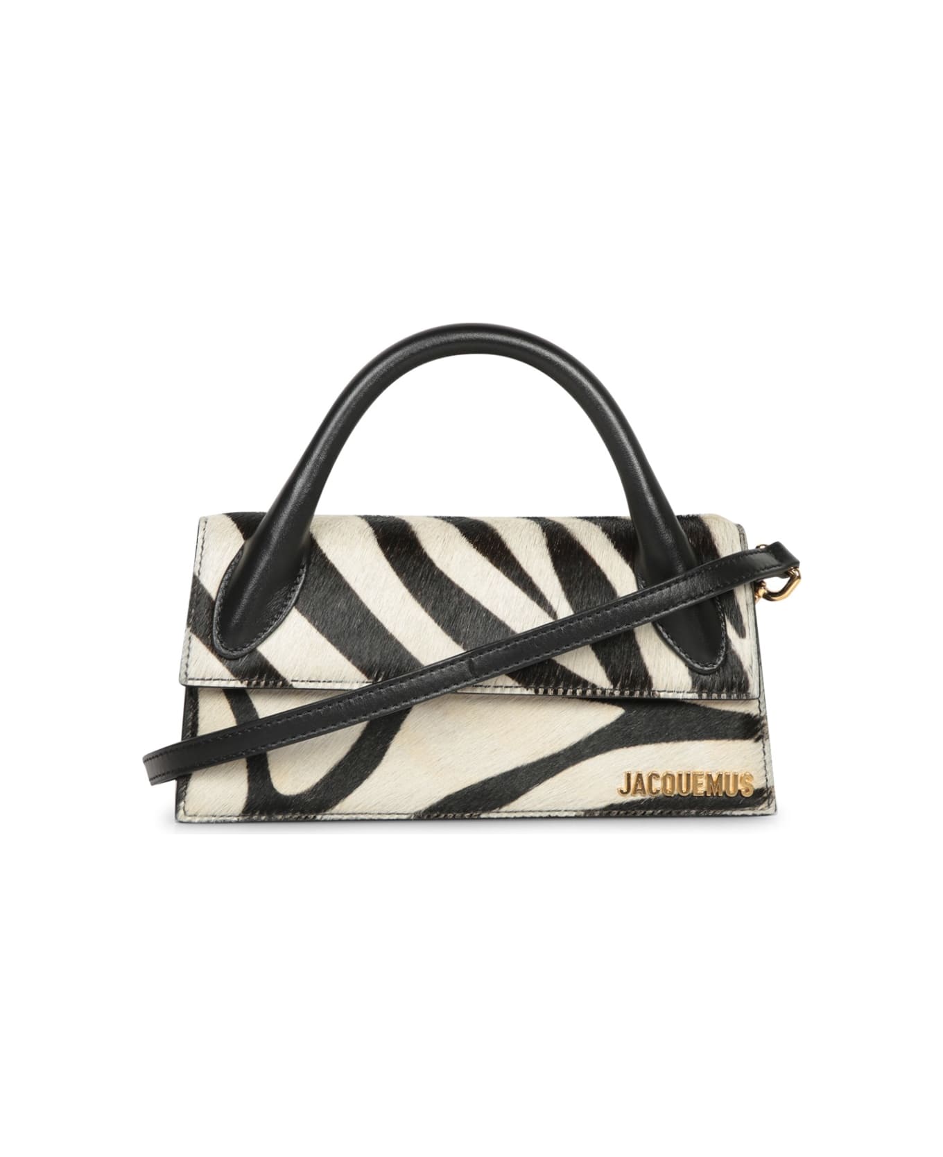 An iconic style revisited, this Jacquemus Chiquito Long bag features a bold zebra pattern on leather, complemented by smooth black leather details and a slender shoulder strap for timeless elegance.