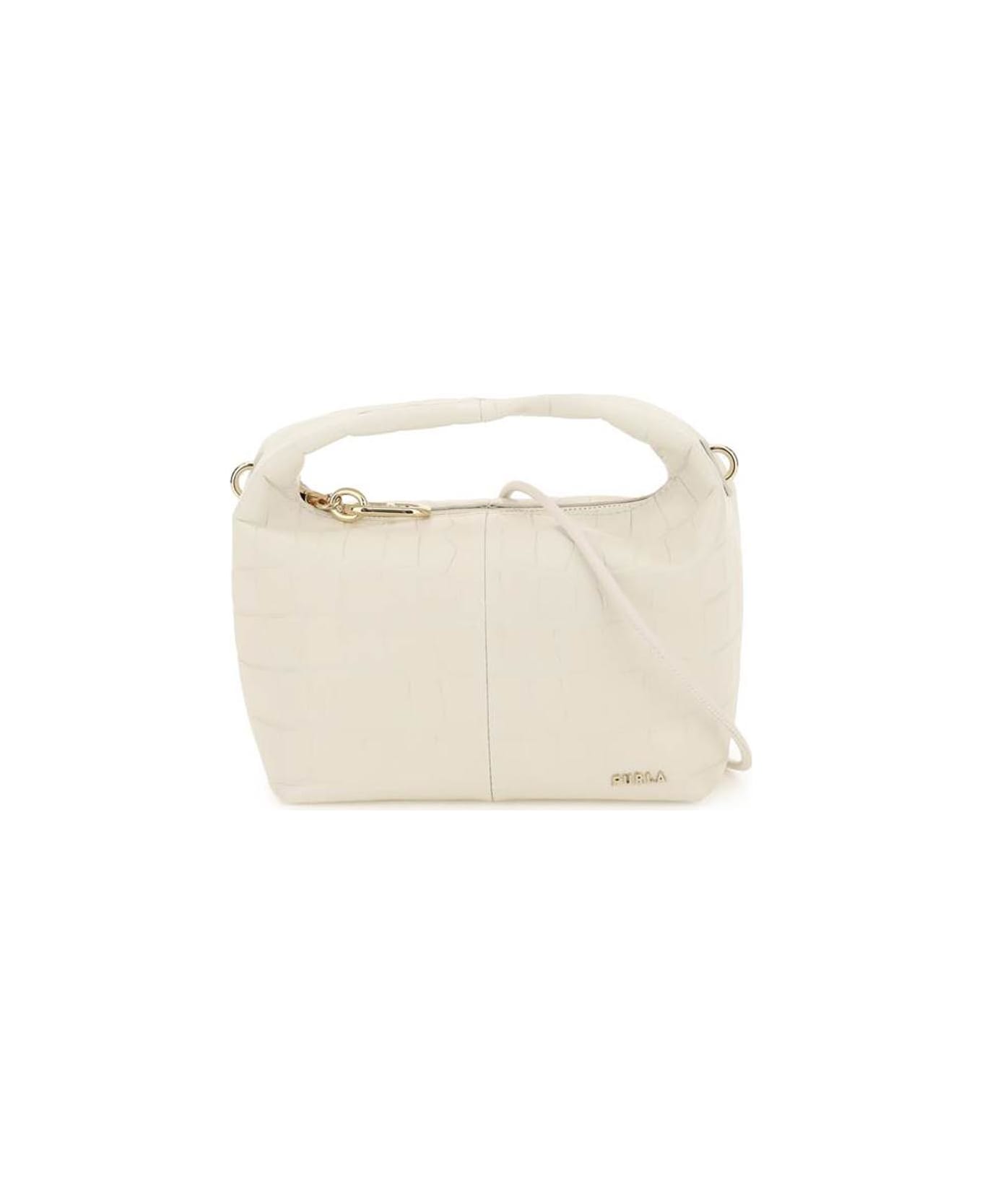 Ginger mini bag by Furla crafted in croco-embossed leather with metal lettering logo applied on front. Single handle, detachable tubular shoulder strap and zip closure with metal Arco puller. Fabric lining and three inner credit card slots. Gold-finished metalware.
