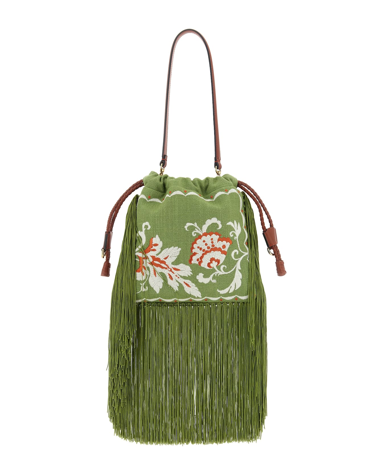 Small 'Kalispera' handbag in linen and viscose blend, contrasting lining, pouch design, front floral embroidery, back embroidery, long fringes at the edges, braided leather drawstring closure, removable leather handle Composition: 70% linen 30% viscose