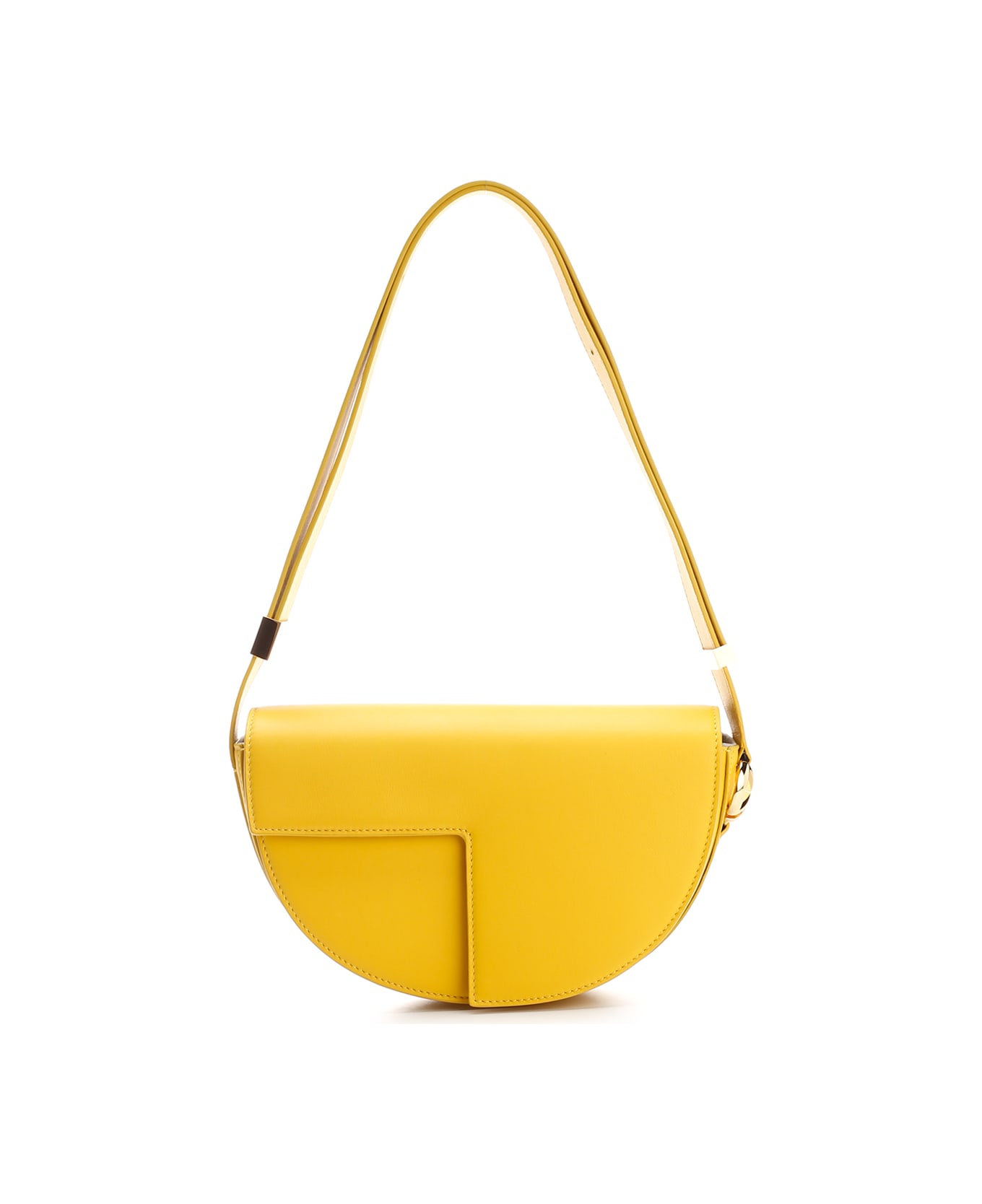 "Le Patou" bag in chestnut brown leather made with leathers recovered from the production cycle. Crescent shape with geometric cuts inspired by Patou's JP monogram. Gold metal details with JP monogram. Adjustable shoulder strap, magnetic closure with gold JP detail. Multiple internal compartments. Limited and numbered edition of 120 pieces.