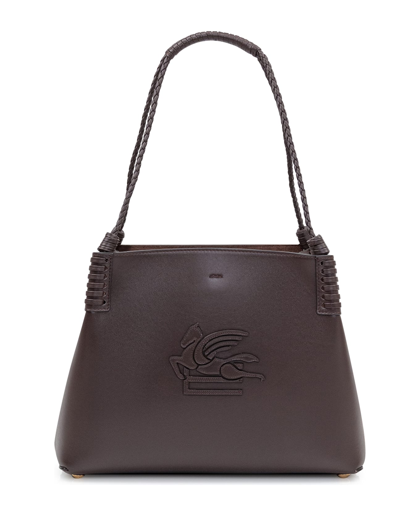 Brown bag. Two handles. Internal hook closure. Inside envelope with drawstring. Embossed detail on front panel. Composition: 100% Leather