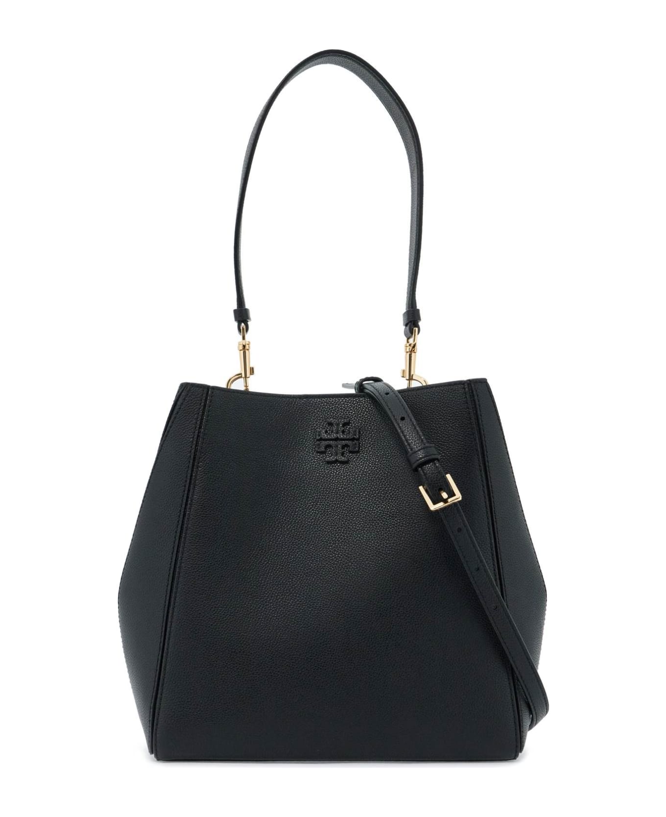 The McGraw bucket bag by Tory Burch is made of hammered leather with a double tone-on-tone T patch on the front. Its design features geometric lines and panel construction, with foldable sides, magnetic closure with carabiner, and a microfiber suede interior with two open pockets. It also comes with a removable single handle and an adjustable additional shoulder strap. The metal accessories have a gold finish.