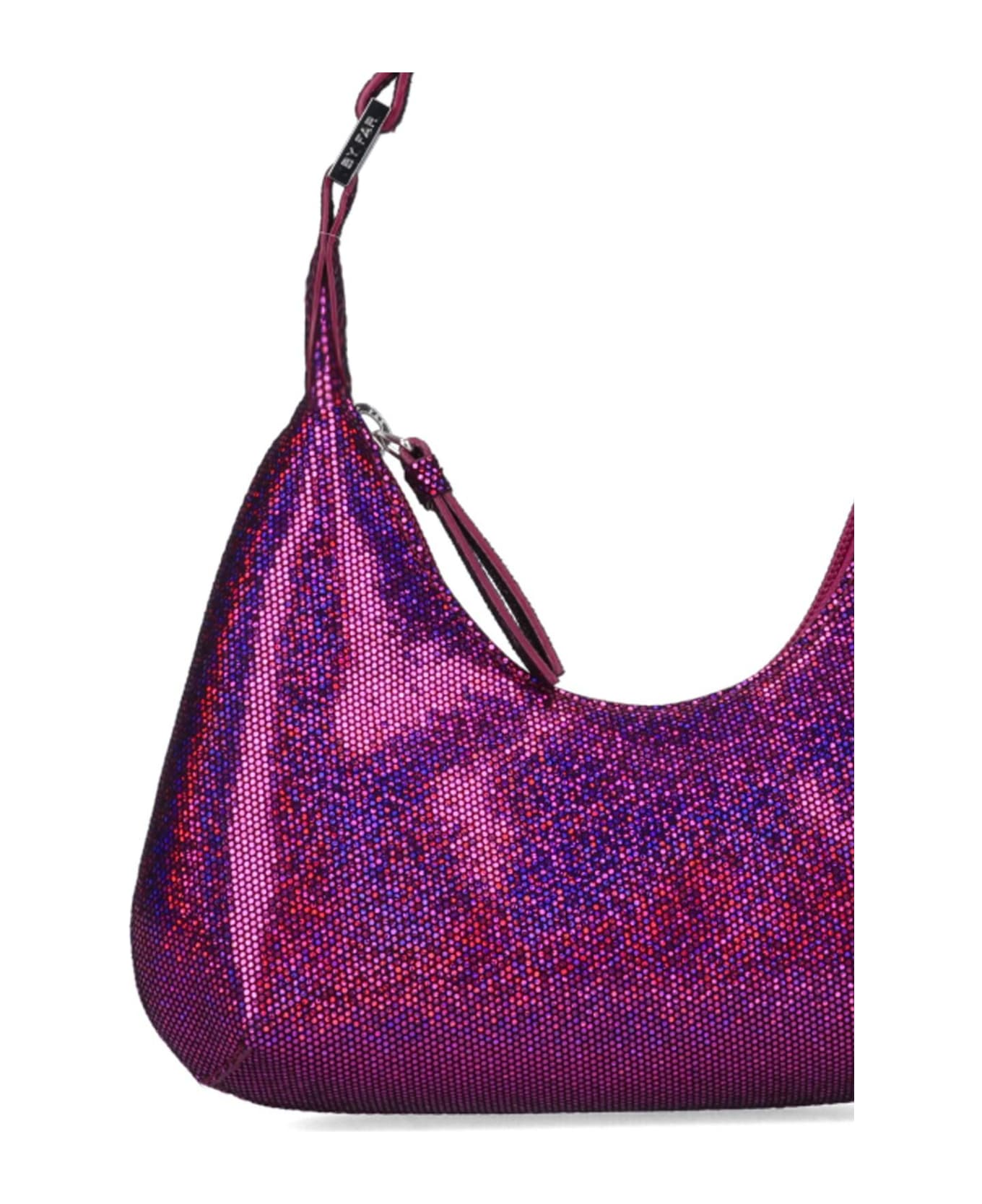 By Far Mini Bag 'Baby Amber', made of rhinestone-effect purple leather, one top handle, metal buckle with engraved logo detail, zip closure, main inside compartment.