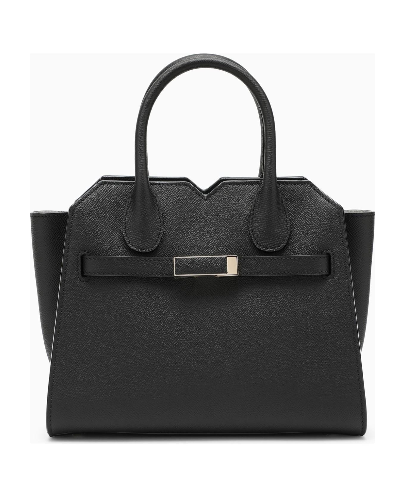 Mini-sized handbag by Valextra made of black leather, featuring two leather handles, a removable shoulder strap, a double closure with magnetic button and side straps, a single compartment, two interior flat pockets with zip and an interior logo print.
