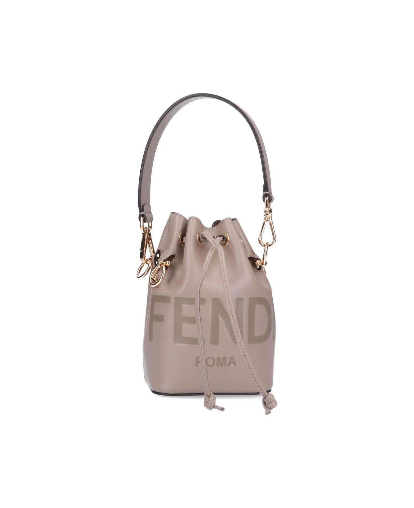 Fendi 'Mon Tresor' Bucket Bag, leather, taupe colour, drawstring closure, removable handle, removable shoulder strap, front embossed logo, golden details, single internal compartment.