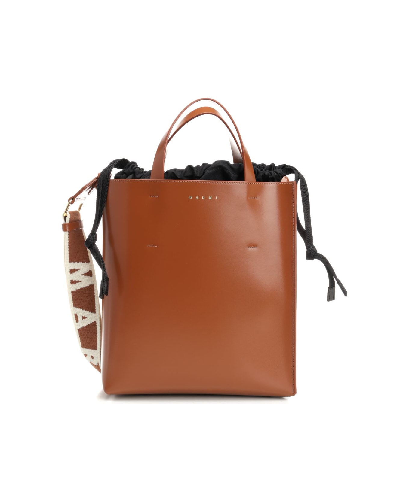 Marni "Museo" tote bag made of smooth calfskin, with fabric interior with drawstring and with embroidered label and logo. It features double top leather handles and an adjustable and removable recycled ribbon shoulder strap with Marni writing. Gold-tone metal elements. Gold-tone logo print on the front. Composition: Body: 100% Calf Leather - Inside: 100% Calf Leather - Contrast: 100% Polyester - Lining: 55% Cotton 45% Polyurethane - Lining: 100% Cotton - Metallic