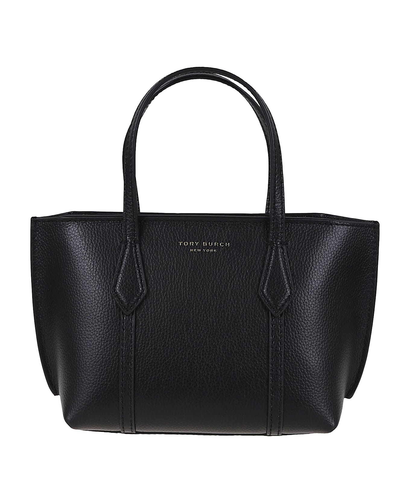 Perry Mini Tote Bag in leather by TORY BURCH. Lined in soft cotton, one interior pocket; zip closure; slim top handles; adjustable and removable leather shoulder strap. Features contrasting TORY BURCH NEW YORK lettering.