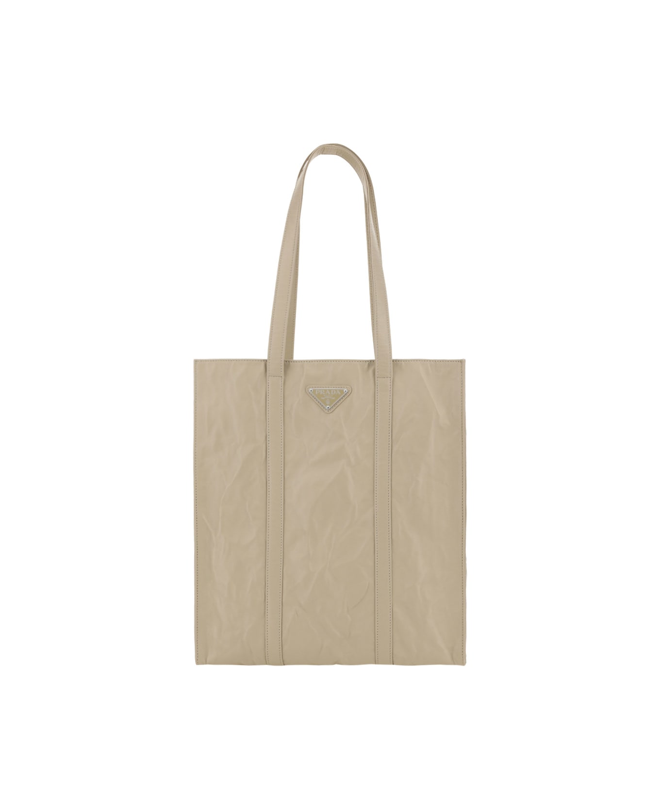 Lambskin shopping bag by prada, two flat top handles, iconic enameled triangular brand signature plaque applied on the front, crinkle effect design, single interior compartment, two zippered welt pockets placed inside. Composition: 100% % Lamb Ovis Aries Aries
