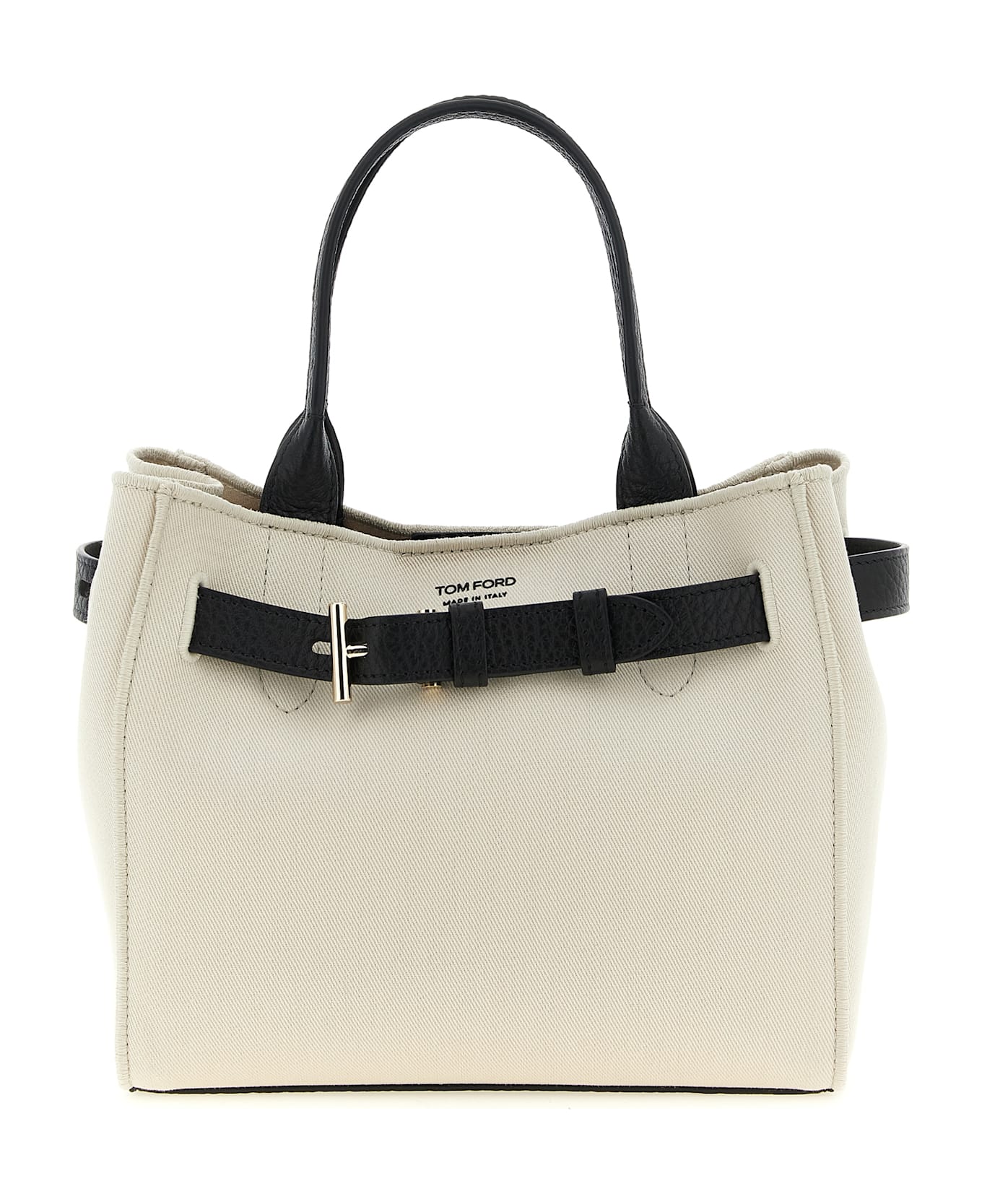 Small 'Audrey' shopping bag in canvas and hammered leather, metal T-buckle strap detail, double fixed handle, internal magnetic closure, rigid bottom, adjustable and removable shoulder strap.
