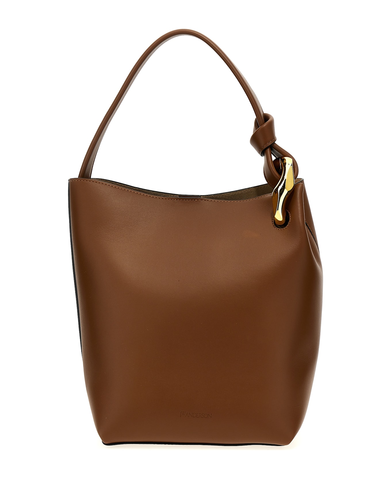 'The JWA Corner Bucket' leather shopping bag with fixed handle with metal chain detail, front embossed logo, magnetic closure.