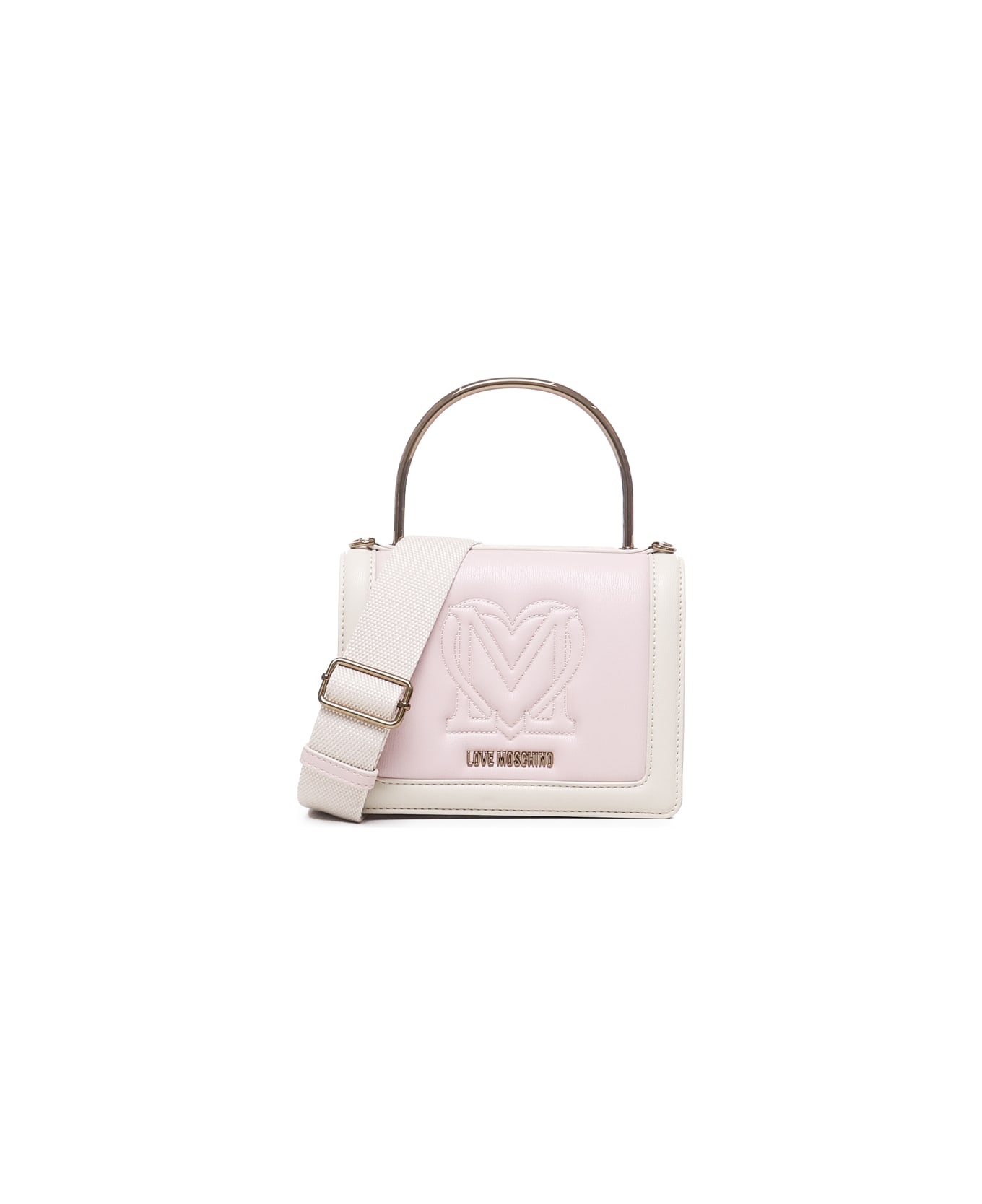 -Monogram sewn on flap -Mini rigid metal handle -Adjustable and removable fabric shoulder strap -Particular flaps on corners -Double clip closure -Measurements: 14 x 19 x 6 cm. -Color: Pink, Ivory
