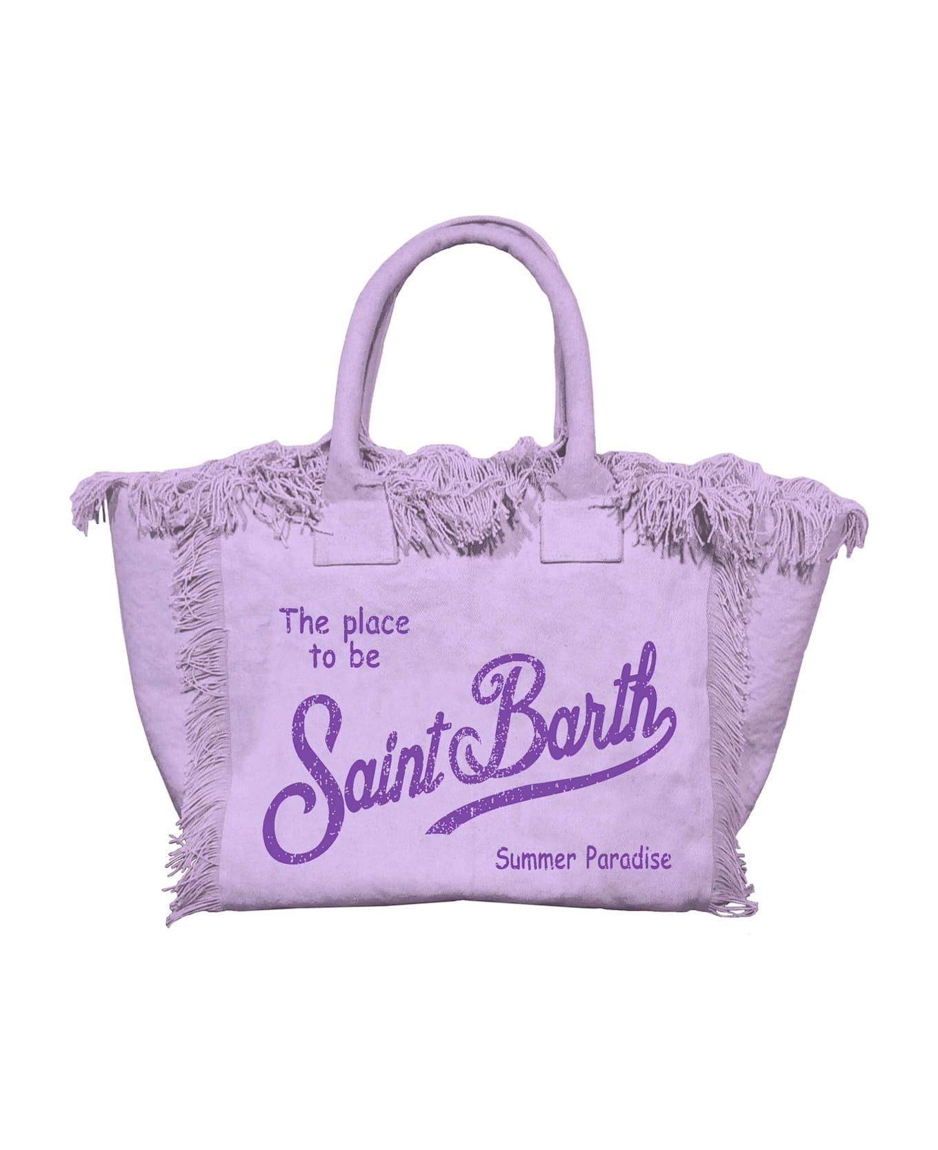Lilac Shoulder canvas bag from MC2 St. Barth, cotton canvas material, exclusive Saint Barth printed logo, zip closure, cotton canvas fringes, internal zip pocket. Dimension:40x32x20