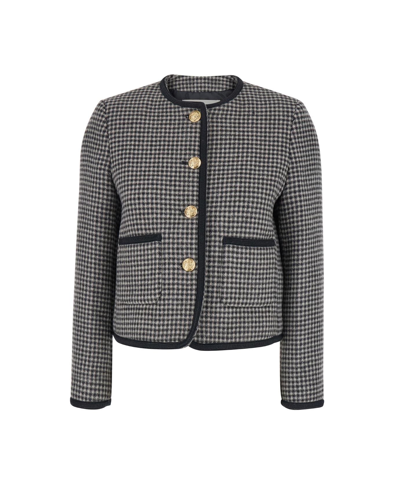 Jacket Grey Crewneck Long sleeves Front button closure Jewel buttons on the front Two front patch pockets Buttoned cuffs All-over check motif Wool blend Regular fit