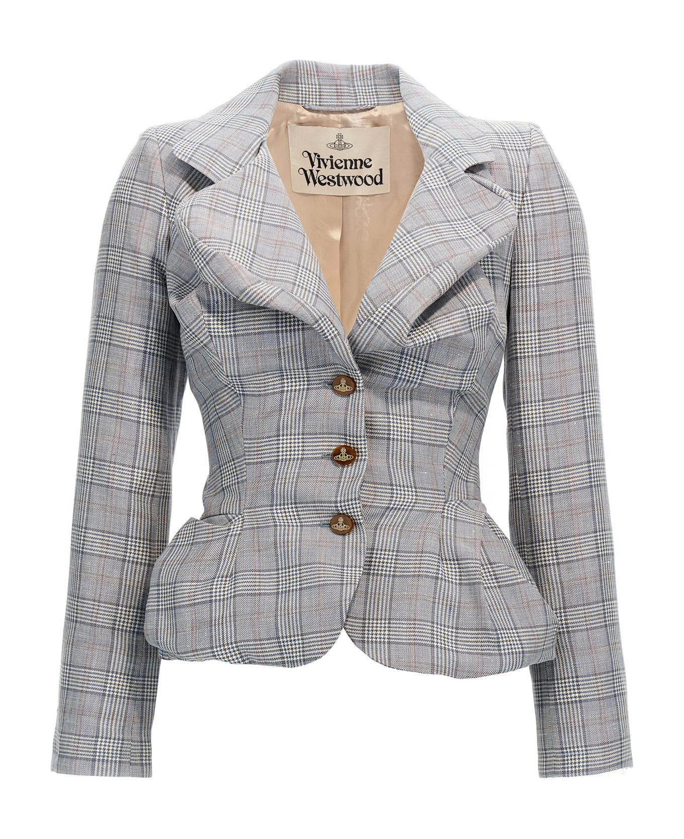 'Drunken' blazer in wool and linen blend with 'Principe di Galles' check print, slanted stitching and distorted silhouette, button closure, pockets, long sleeves, slightly padded shoulders. Composition: 50% wool, 50% linen