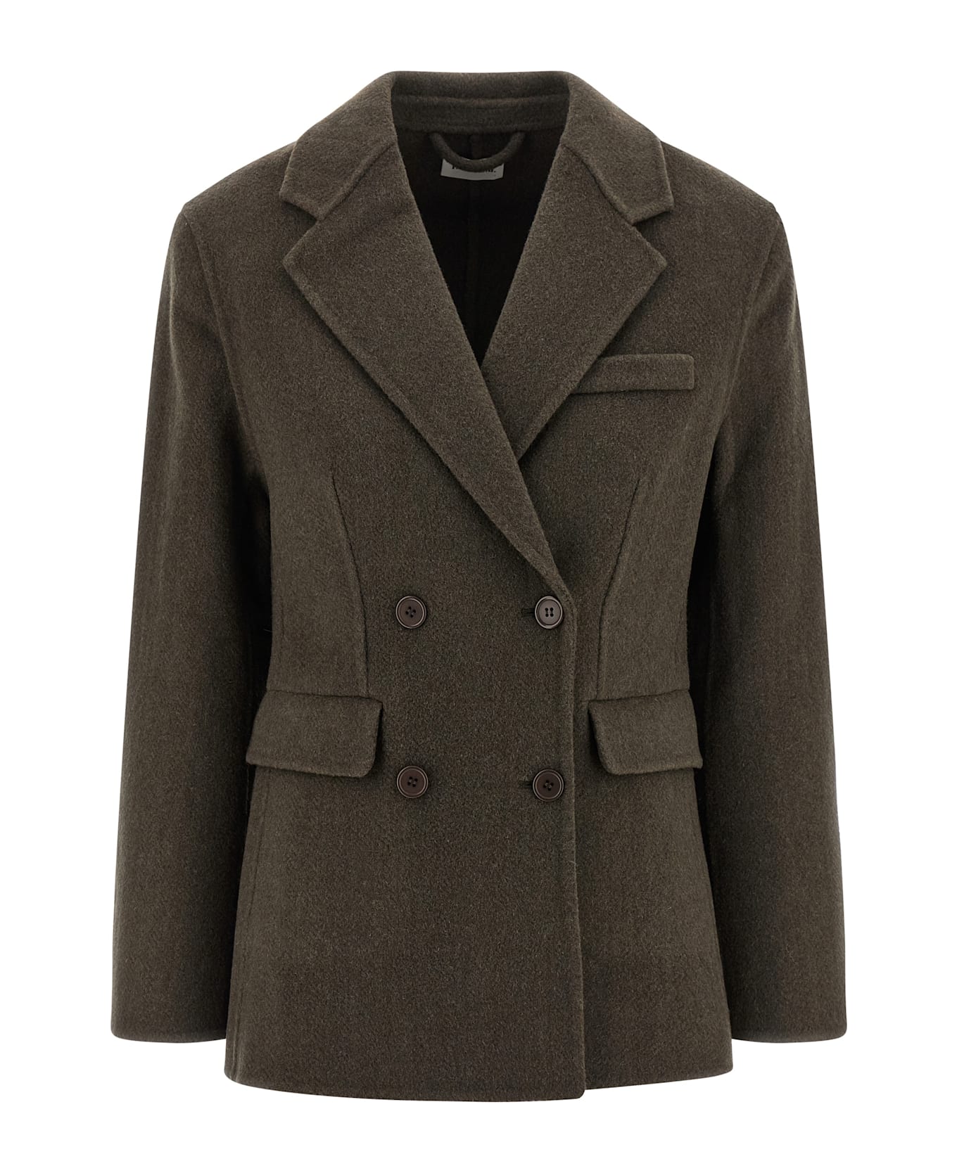 'Legend' double-breasted wool cloth blazer with front button closure, mirror lapels, breast pocket, flap pockets, long sleeves, slightly padded removable shoulder strap, back vents, unlined.